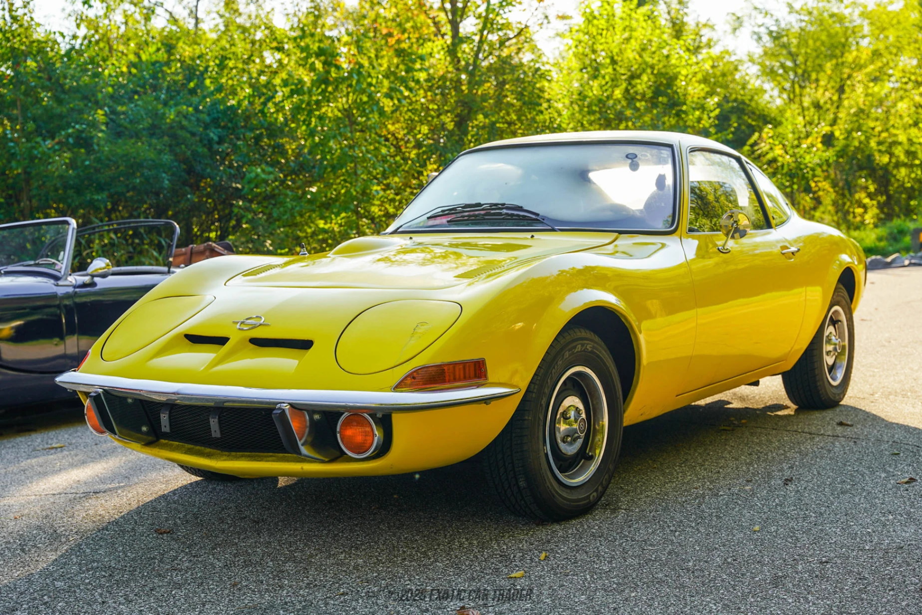 This 1972 Opel GT wears a Sun Yellow suit, shining brightly while it rolls on simple 13-inch steel wheels. It’s a Luxus trim vehicle, we’re told. Those interesting headlamps might look like traditional pop-ups but in fact, they rotate sideways, at the same time and in the same direction. Plus, they’re not powered, but manually activated via a center console-mounted lever. Other features of this car include chrome bumpers and circular taillamps that reminisce back to those worn by a certain prolific Italian automaker in the same period. Oh, and this car is positively diminutive. It’s under 162 inches long, just over 62 inches wide, and a mere 48 inches in height. The black interior of this 1972 Opel GT features a full suite of gauges including a tachometer, a heating and ventilation system, and a newer radio. This is a retro-styled unit with modern media connectivity choices. We see that an aftermarket clock has also been installed within the speedometer’s glass surface. The car is a two-seater with black leather seats, and a padded luggage area behind them. Here, we can also spot two aftermarket speakers, driven by the modern head unit in the center console.
