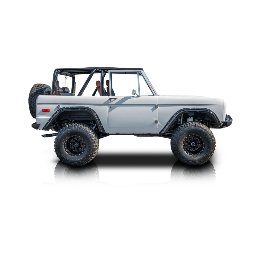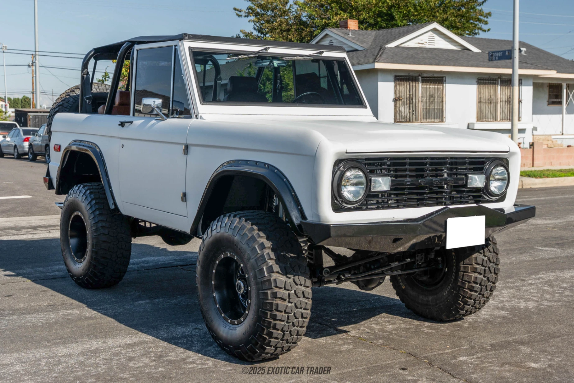 Dressed in Matte White, this 1973 Ford Bronco sits tall thanks to its custom lifted suspension system that is required to accommodate its custom forged alloy wheels and proper off-road tires. The vehicle also features a custom painted grille, custom headlamp bezels and a Warn winch mounted at the front. It’s also got a custom undercoating to keep it safe from the elements. There are flush inner fenders, hood struts and plenty of things to keep your eyes busy as you gaze upon this distinctive machine. Hop aboard its custom two-tone interior and things get even more interesting. You’ve got air conditioning, a rear-view camera an aftermarket center console, a Bluetooth-capable head unit, and aftermarket speakers. Everything appears to be meticulous, and if you were to pop the hood, even the air conditioning compressor is polished.