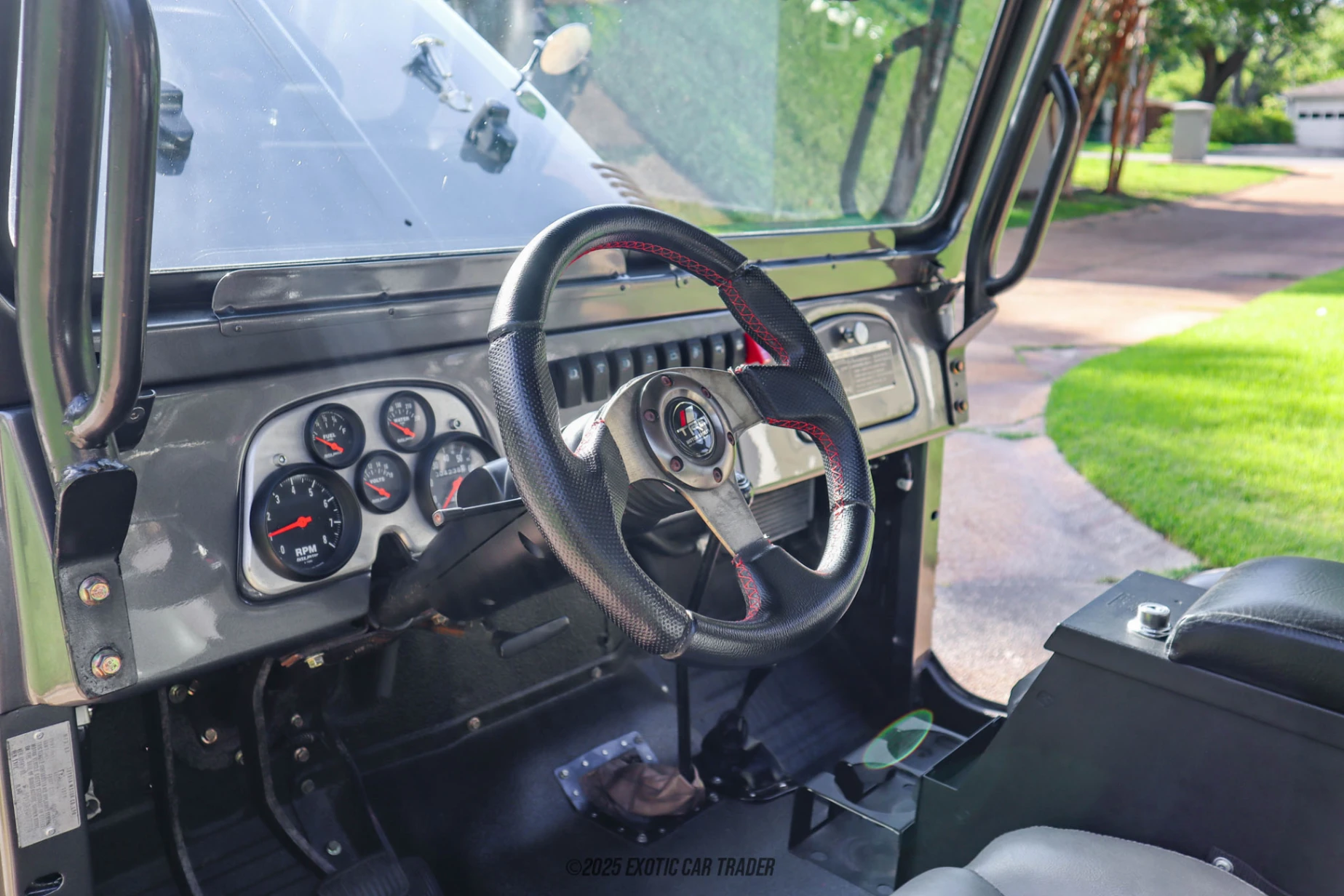 This 1974 Toyota Land Cruiser FJ40 wears gray paintwork, but you’ll likely miss that for its airy outlook. Yes, it’s a lovely open-air affair sans doors and roof, with a custom roll cage for safety. We’re told that the turn signals and brake lights have been upgraded to LED units, while the headlamps have undergone an H4 conversion. There are custom tube bumpers, front and rear bumper-mounted auxiliary lights, and Line X Bed liner coated side steps to aid entry and exit into this high-riding off-roader. Plus, its 17-inch XD wheels and Nitto 33-inch tires certainly look as good as they perform. The custom interior of this 1974 Toyota Land Cruiser FJ40 features leather reclining front seats and reupholstered rear jump seats. There’s a set of Auto Meter gauges and a custom lockable center console for safe storage. You’ll also find a 7-inch DVD-capable navigation system hooked up to an upgraded JL Audio speaker system for your musical needs. A sporty aftermarket steering wheel with TRD center cap has also been installed.