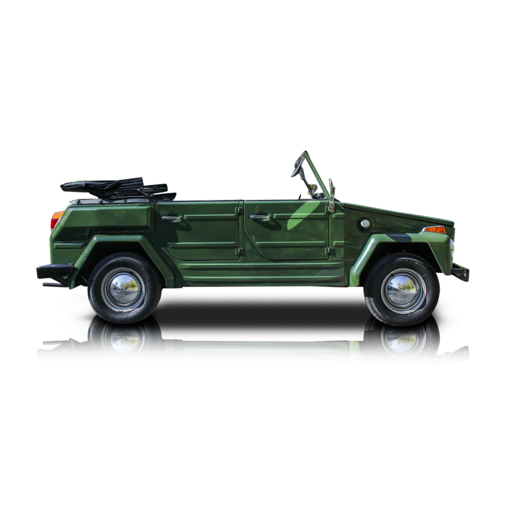 Repainted in Army Green, this 1974 Volkswagen Thing certainly looks like nothing else. Indeed, no automaker could make something like it today without falling foul of regulatory requirements. The car comes with 14-inch steel wheels wearing chrome VW hubcaps, a fold-down windshield, side curtains that are removable, and a black convertible top. While the shape is distinctive, it’s got some recognizable elements too, such as rear lamp clusters from the Beetle. We’re also informed that the full-size spare wheel, jack and tool roll are included with the sale too. The interior of this 1974 Volkswagen Thing comes with four reupholstered seats in black and an overall spartan environment. Yes, you’ve got a dashboard, speedometer and the major driving controls, but little else in the form of creature comforts or, whisper it, luxuries. That’s fine because this Thing is meant to make you think, appreciate modern life’s fripperies, and realize that your parents and grandparents made do with much less.
