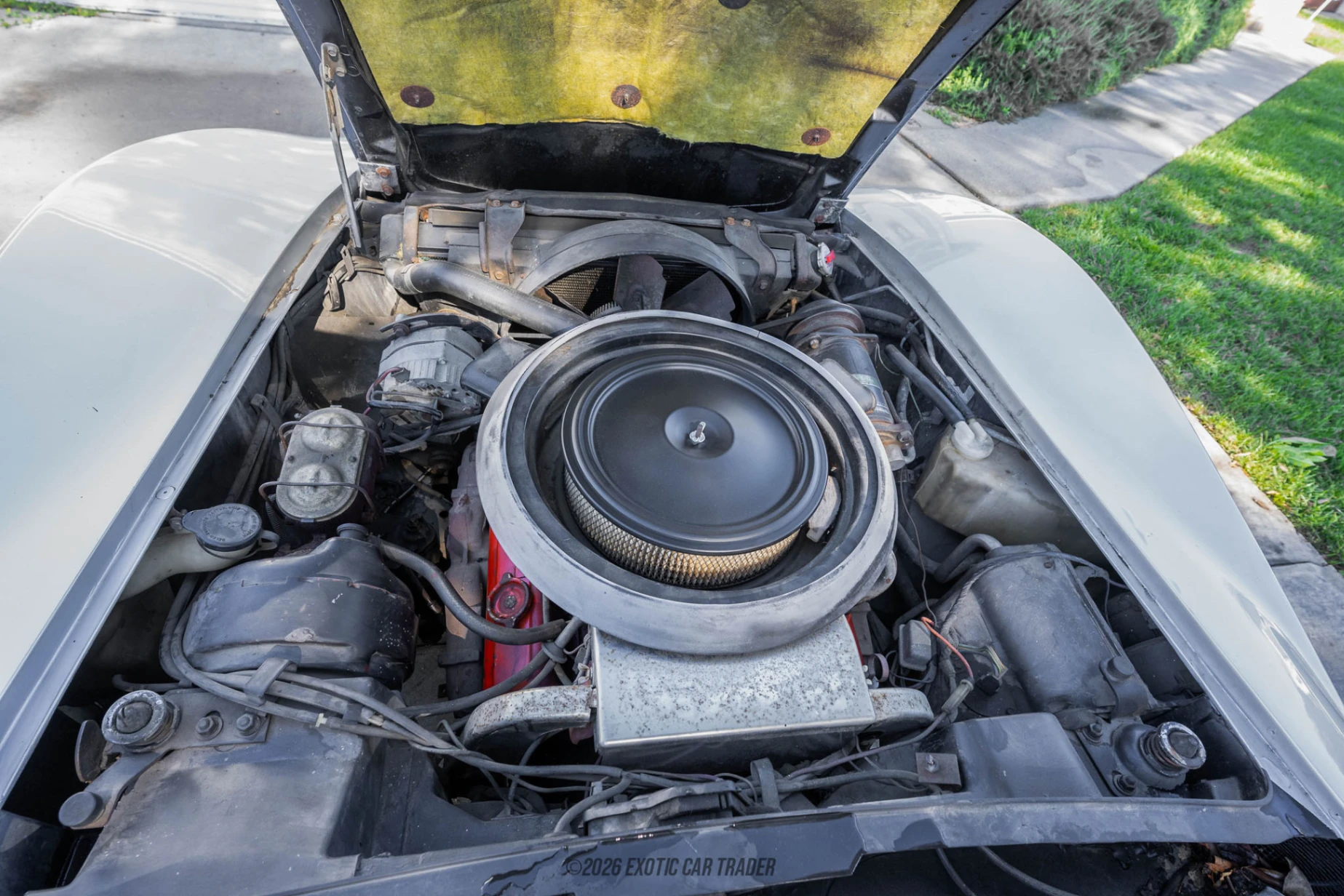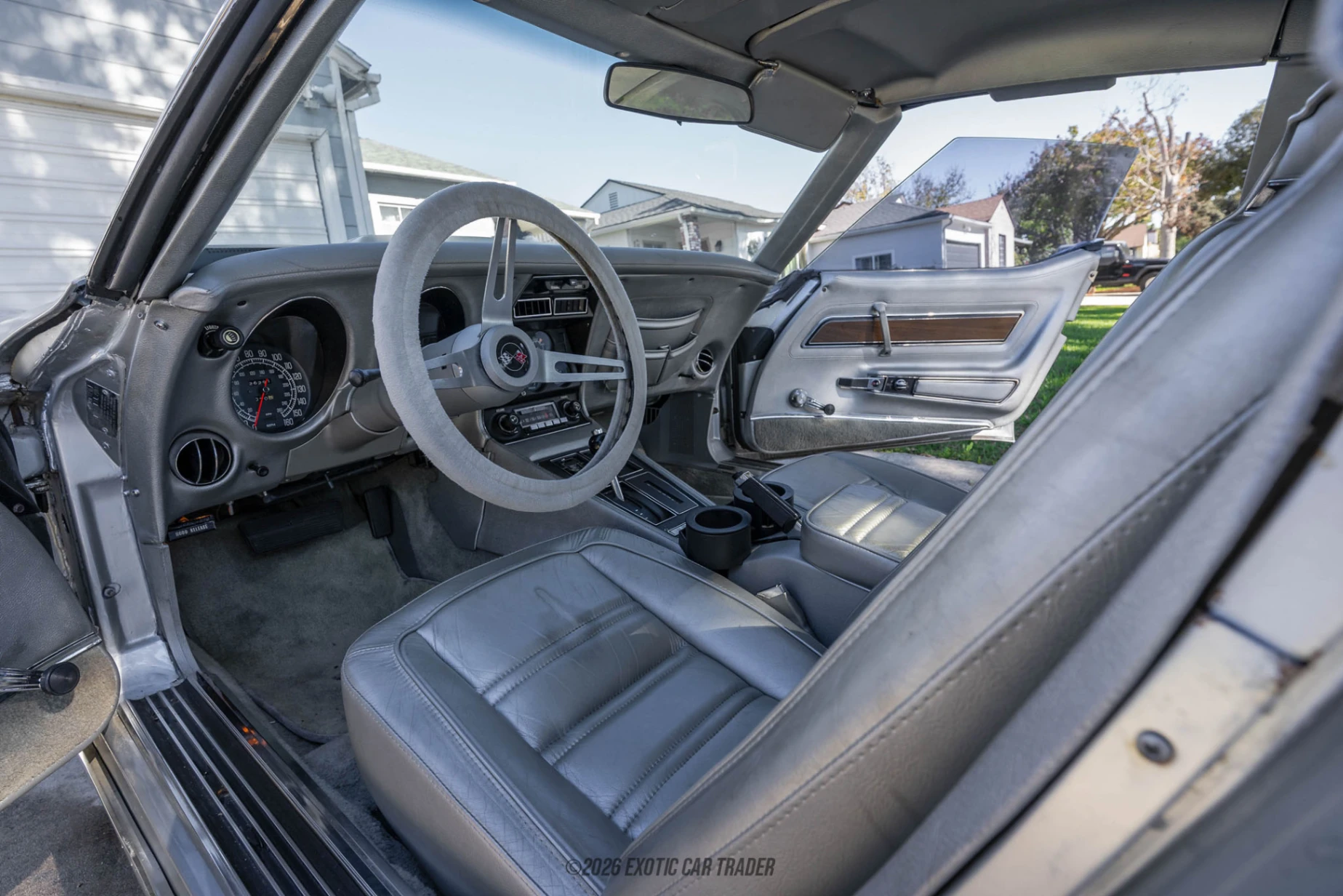 Wearing a silver suit, this 1975 Chevrolet Corvette looks pretty potent even though its over fifty years old now. Bill Mitchell didn’t change the Mako Shark II’s looks too much, resulting in one of those rare cars that is rather similar to its concept. You’ve got pop-up headlamps, dual removable T-tops and a smooth, single-piece rear deck. One minor casualty of this is that the trunk must be accessed via the passenger compartment. The interior of this 1975 Chevrolet Corvette comes in gray and seats two adults with plenty of space. After all, the Corvette is a grand tourer, not a cramped, stripped out racer. So, the seats are upholstered in leather, the frameless doors contain some wood trim, and there’s a push-button radio in the center console. The car also has air conditioning, evidence of which can be seen under the hood with a sizable Frigidaire compressor coupled to the V8 that also lurks there.
