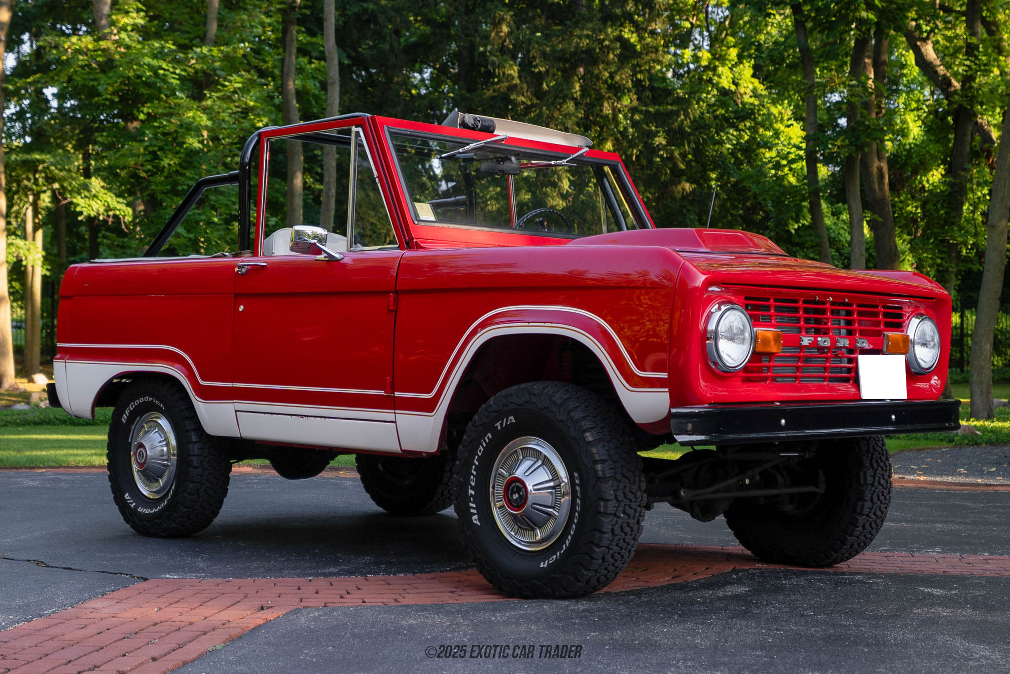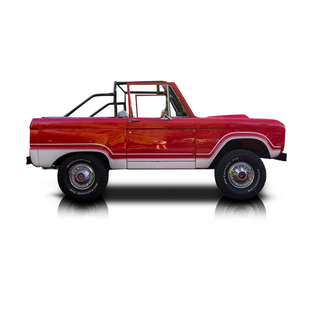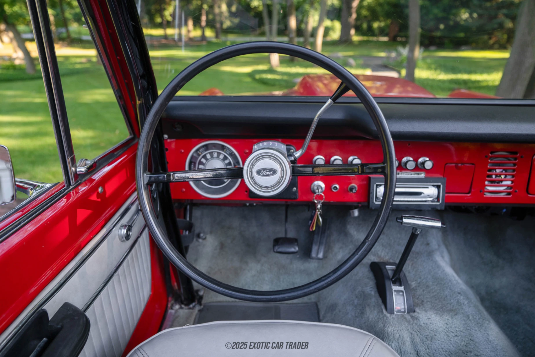 This boxy off-roader is a testament to a time when design was simple, yet effective. This open-top Ford Bronco features a stunning classic red paint finish, contrasted by a cream lower. A roll bar adds both visual presence and practical safety for open-top driving, and the chrome hubcapped wheels, wrapped in chunky BF Goodrich rubber, provide off-road ability. Inside, the cabin is trimmed in Grey upholstery, offering a clean, functional layout that complements the rugged nature of the vehicle. You'll find manual window winders, red seat belts, and a large, thin-rimmed, two-spoke steering wheel with the Ford oval at its center.