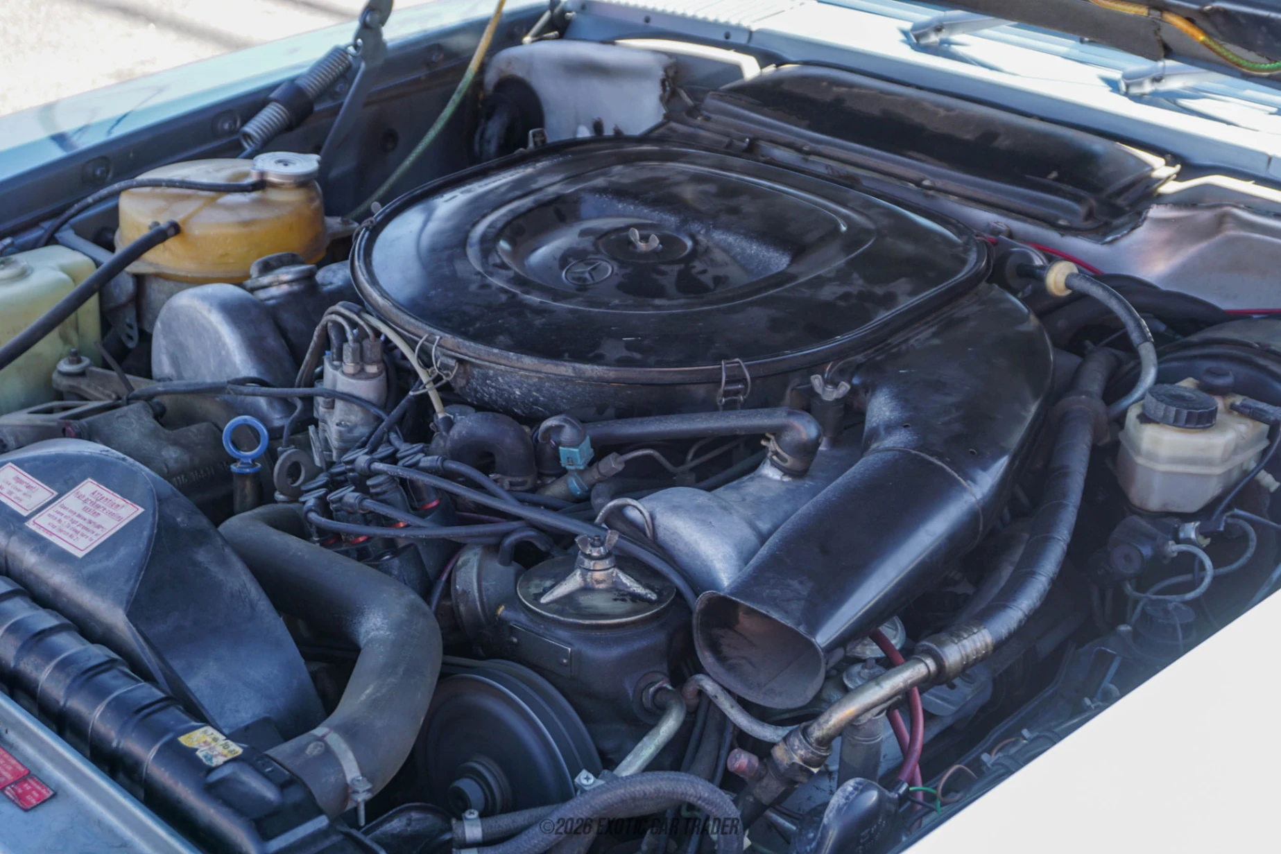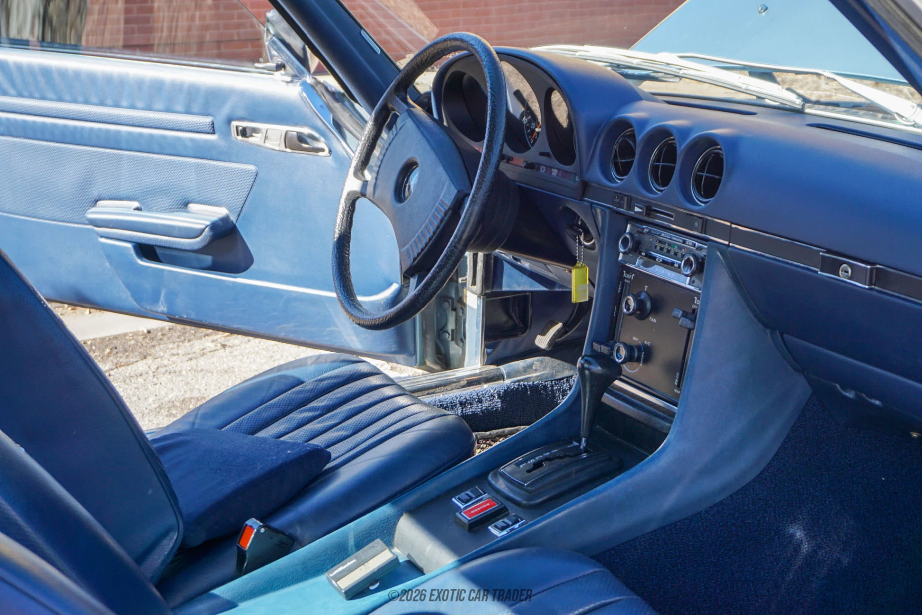 Dressed in blue, this 1976 Mercedes-Benz 450SL rides on original wheels and showcases its North American market mandated features. These include dual sealed-beam headlamps and elongated bumpers, due to safety regulations at the time. Considered to be ugly additions at the time, today, they gel well with the car, and are representative of a time when automotive safety was fast becoming a buzzword. This car also comes with its matching blue removable hard top included with the sale. The blue two-seat interior of this 1976 Mercedes-Benz 450SL comes with a power antenna for its Becker Mexico cassette stereo head unit, power windows and climate control with air conditioning. In fact, if you look at the sliders, you’ll see that it’s an early dual-zone temperature type. There’s some luggage space behind the two seats, plus the regular trunk behind the passenger compartment.