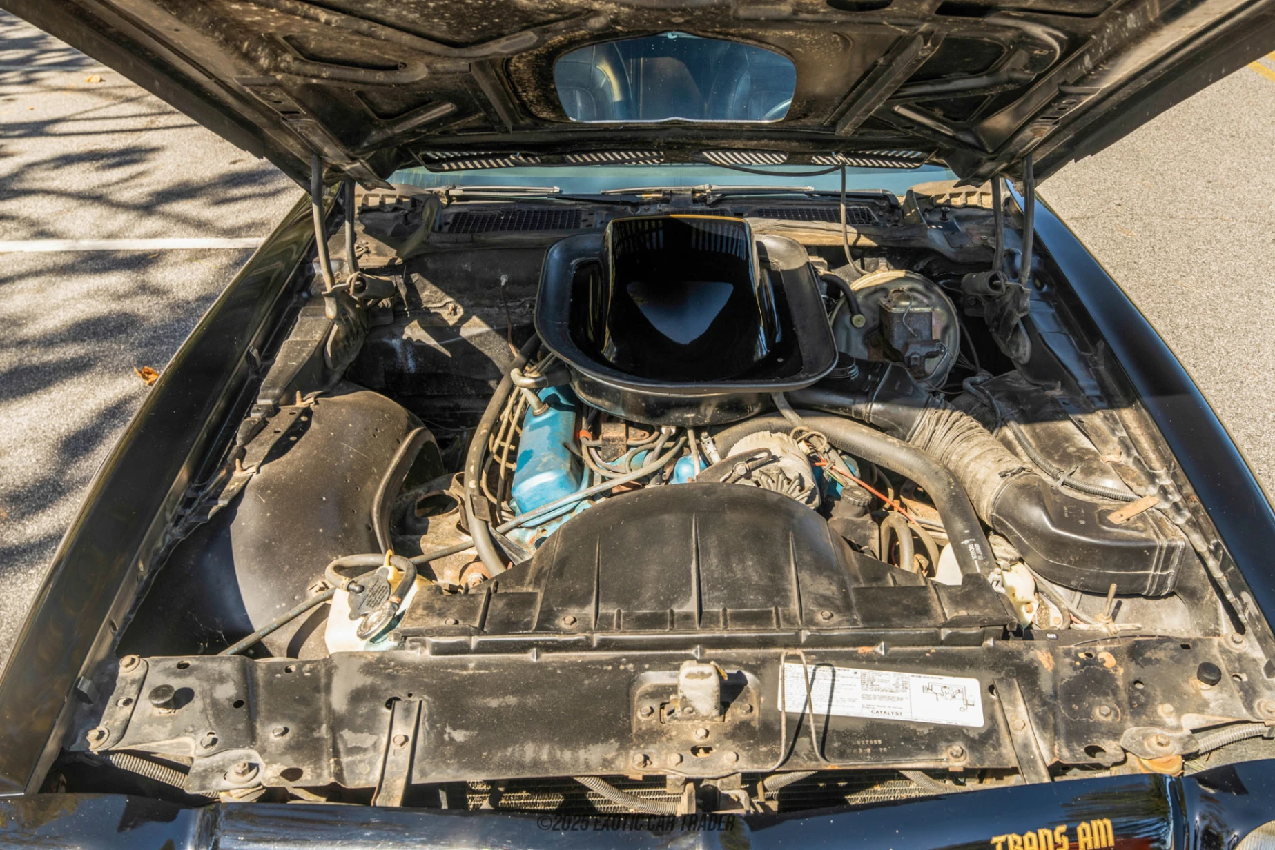 This stylish 1976 Pontiac Firebird Trans Am 50th Anniversary Edition wears a Starlight Black coat of paint, punctuated by some gold “Trans Am” and the iconic screaming chicken hood decals. It’s also got 50th Anniversary exclusive gold pinstriping and accents, plus 50th Anniversary exclusive fender badges. Its wheels are also in gold, a set of 15-inch honeycomb wheels that really look awesome. Black chrome exhaust tips are present as well. The interior of this 1976 Pontiac Firebird Trans Am 50th Anniversary Edition comes with black leather seats and red carpeting. It’s a nice place to be, with a gold-accented, engine-turned aluminum dash panel as well as a gold-spoked Formula steering wheel. You’ve also got removable targa roof panels, a push-button radio, a heater and a rear window defroster. Pop the trunk and there’s enough space, plus a spare tire and a fire extinguisher which is always prudent to have in any classic car.