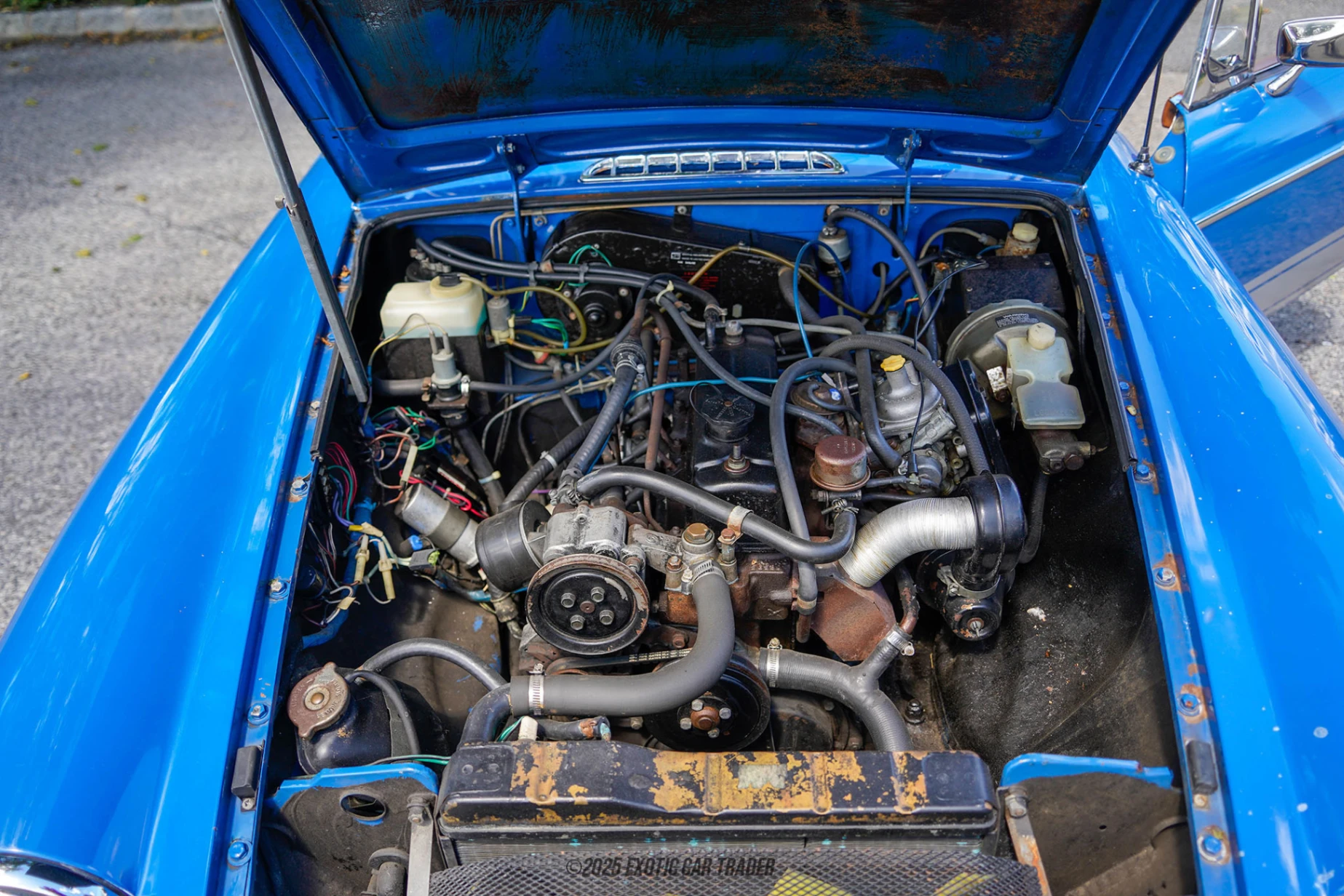 A stunning shade of Royal Blue adorns the exterior of this 1977 MG MGB Convertible. It is punctuated and contrasted in such period fashion with prominent white stripes running the length of the lower thirds, with the MGB text inscribed to remind onlookers as to exactly what this is. Moving inside, the cabin is trimmed in Cooper, keeping to a simple yet stylish presentation that suits the period. The interior layout is straightforward, with analog gauges and classic switchgear designed to keep the driver engaged. You’ll find analog gauges for the speed, rpm, fuel level, oil pressure, water temperature, and a quartz clock. The interior looks well-preserved, as one might expect of a car with such low mileage, with the text on the control stalks clearly visible and the gear knob and pedals seemingly unworn.