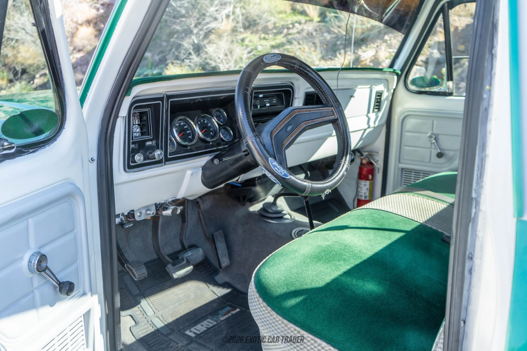 The exterior of this 1978 Ford F-250 Custom Highboy is finished in a classic green and white two-tone color scheme, further enhanced by a custom paint job that gives the truck a clean yet period-correct presence. Its tall factory stance is complemented by aftermarket wheels, giving it a slightly more aggressive look while maintaining its vintage charm. Practical additions such as a bed mat cover help preserve usability, while the overall condition reflects careful ownership over the years. The interior of this 1978 Ford F-250 Custom Highboy is finished in a complementary green and gray color combination and has been reupholstered to provide a refreshed and comfortable cabin environment. Modern touches include an aftermarket sound system and auxiliary gauges, offering improved functionality without straying too far from the truck’s original character. With both air conditioning and heating equipped, this classic truck is well-suited for comfortable driving in a variety of conditions.