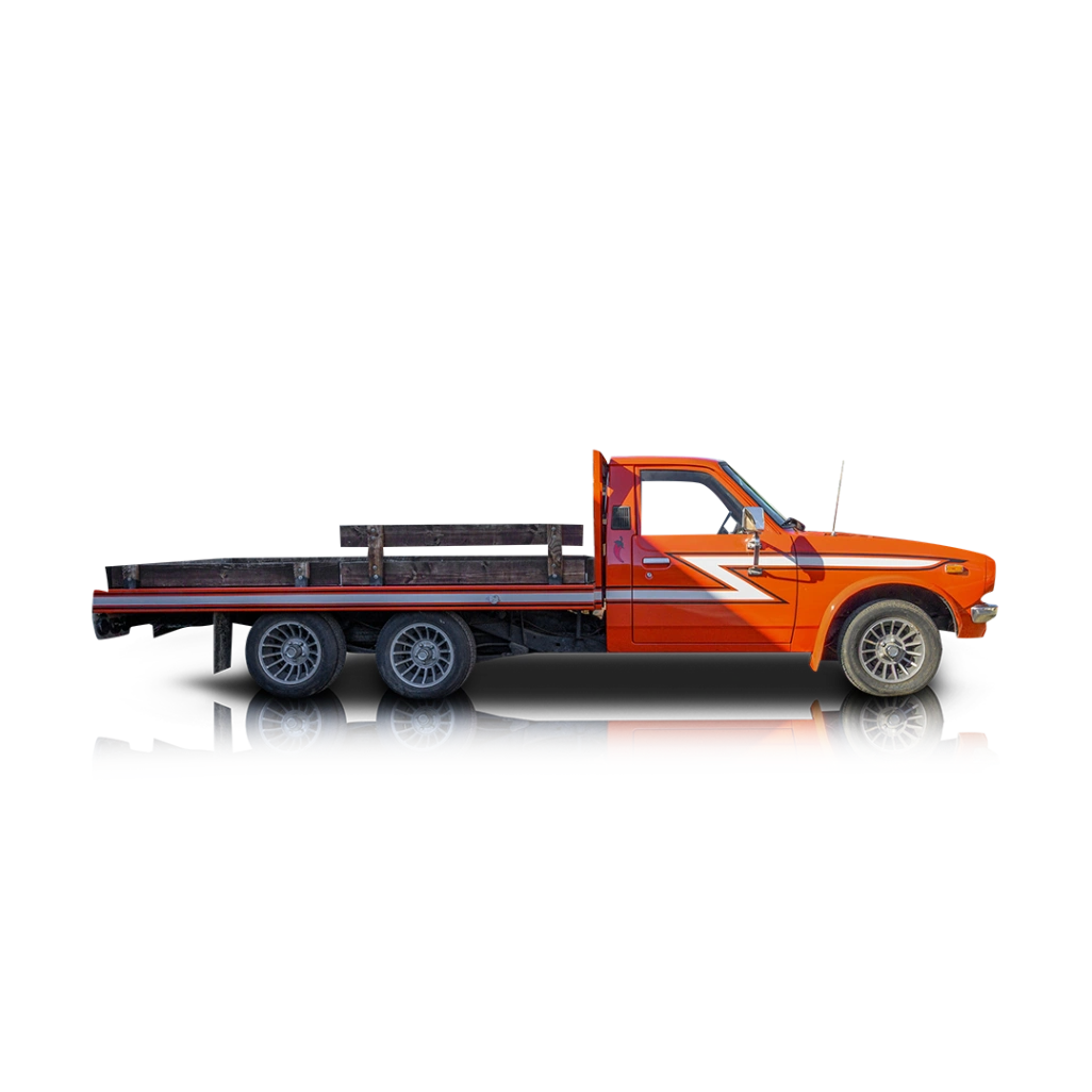 Dressed in red, this 1978 Toyota Hilux RN28L is a bit different from the rest, which becomes apparent as soon as you see its side profile. Then, you’ll notice that it’s got two rear axles instead of one! All axles are fitted with alloy wheels, though. The two rear axles support an extended flat bed which leads us to believe that this Hilux was used as a car carrier. It’s also got branding by ‘The Turquoise Shop’, as well as some nice white details along the sides. The black interior of this 1978 Toyota Hilux RN28L is a nice period-correct time capsule, with two fabric seats, a two-spoke steering wheel and a floor-mounted shifter. The only modern touch is a newer Bluetooth-capable head unit from Dual; everything else right down to the gauges, switchgear and heater controls is stock.