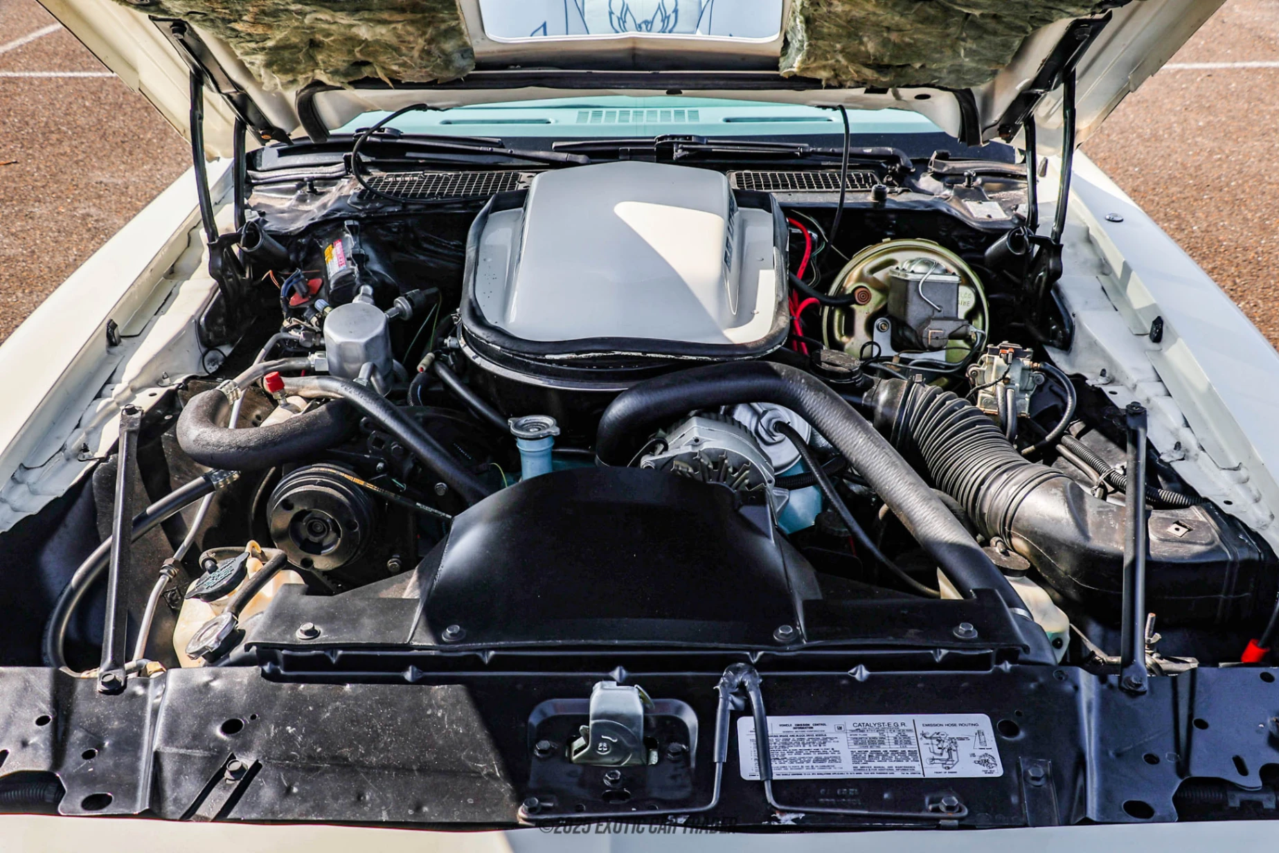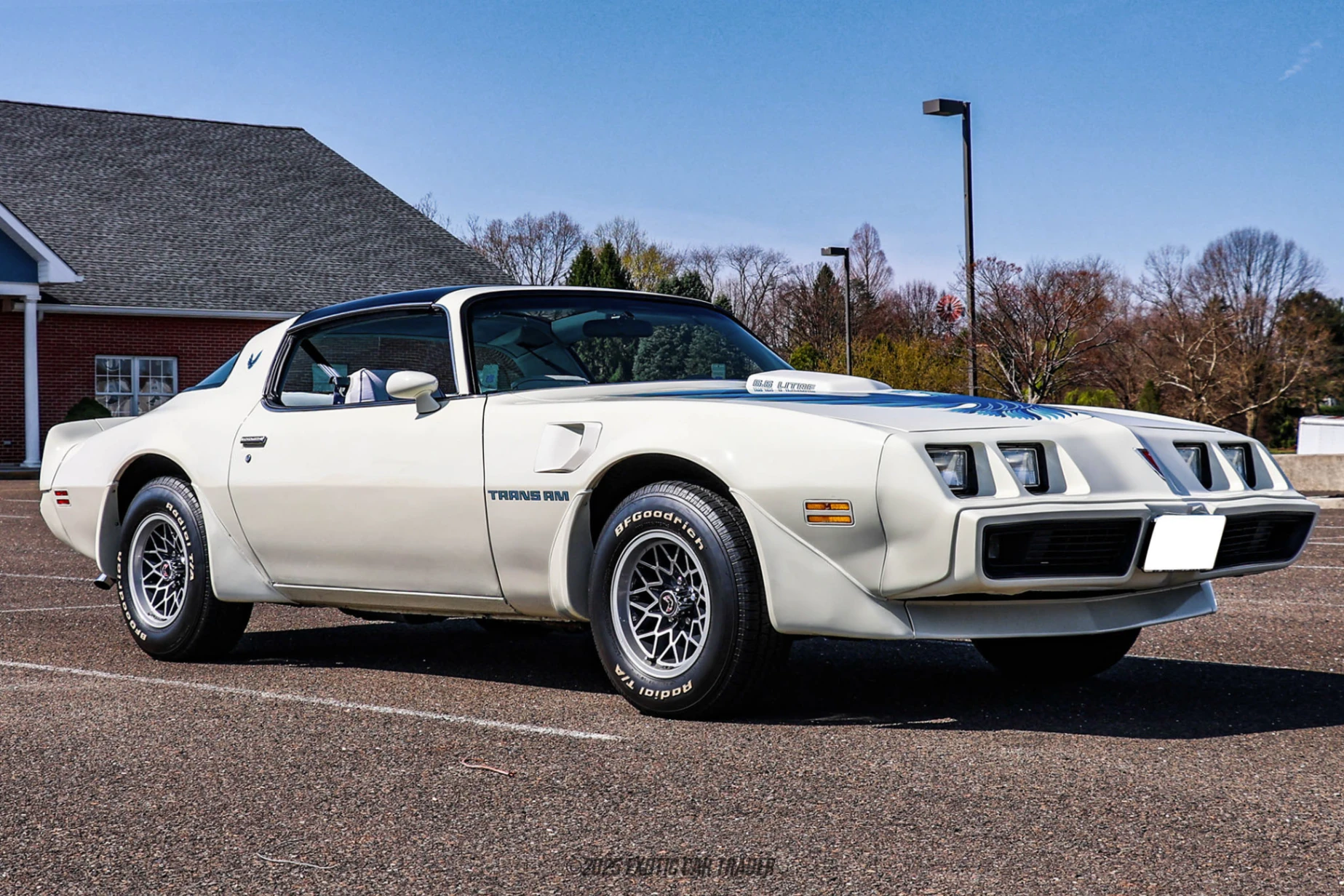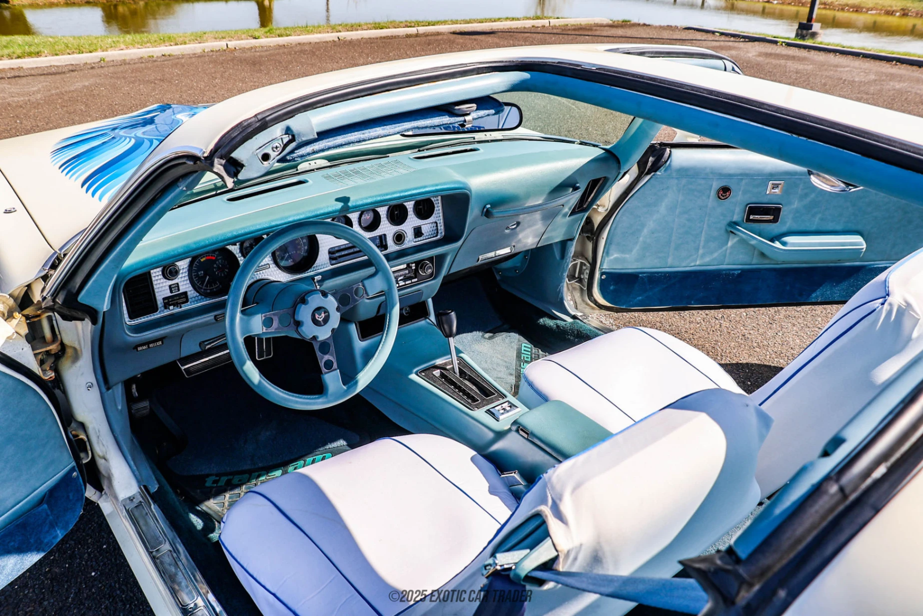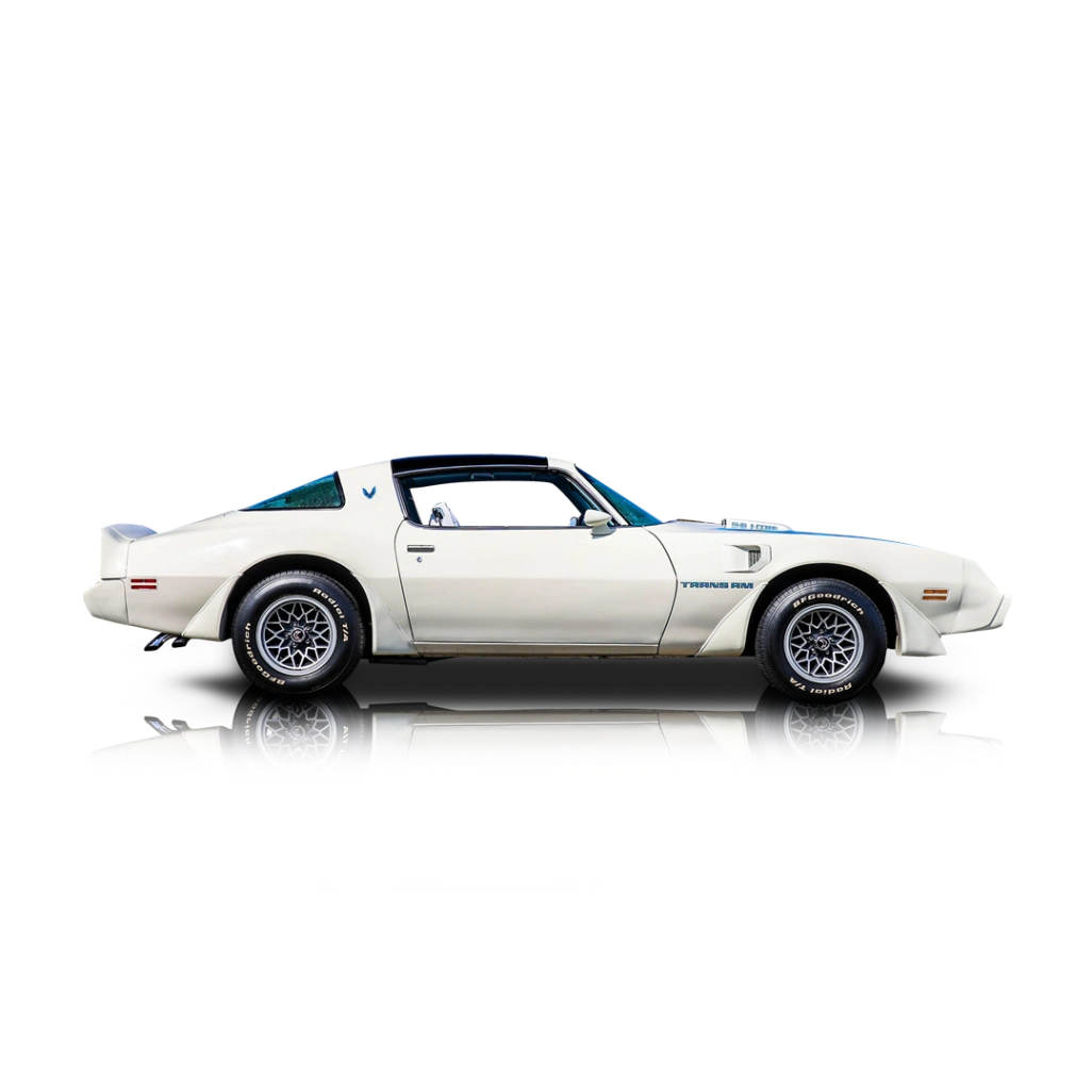 Dressed in a clean white suit, this 1979 Pontiac Firebird Trans Am is stunning at first glance. Its quintessential Seventies design is punctuated by its Shaker hood and the iconic Screaming Chicken decal adorning it in mid-blue. You’ll find more Chicken decals in blue along the body of the car, as well as Trans Am script. Meanwhile, the car’s quad headlamps stare you down while it rolls on its 15-inch Snowflake wheels wrapped in BF Goodrich Radial T/A tires. There’s even a T-top roof for that open-air experience when the mood is right. The all-original blue interior of this 1979 Pontiac Firebird Trans Am comes with Trans Am seat covers and the original AM/FM radio too. It’s a wonderful place to spend time in, accessed via frameless doors and providing the driver with a full gauge pack. There’s also an air conditioning control panel which is great if you reside in a hotter part of the country. If not, heating and defrosting is present too.