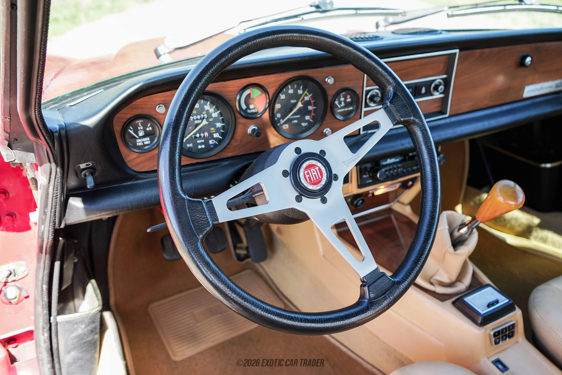 The exterior of this 1982 Pininfarina Spider 2000 Turbo is finished in Cherry Red, a vibrant and period-correct color that accentuates its classic Italian lines. The long hood, short rear deck, and clean proportions reflect Pininfarina’s signature design language. Unique touches such as gold turbo badging and pinstriping distinguish this turbocharged model from standard Spiders, while the 14-inch Cromodora alloy wheels complete its vintage sporting look. The tan convertible soft top provides an elegant contrast and allows for open-air driving enjoyment, staying true to the roadster experience. The interior of this 1982 Pininfarina Spider 2000 Turbo is finished in tan, offering a warm and inviting cabin that complements the exterior beautifully. The layout is simple and driver-focused, with classic analog gauges and straightforward controls. A standout feature is the addition of a turbo boost gauge, reminding the driver of the car’s unique forced-induction setup. The cabin emphasizes a pure, analog driving experience, free from modern distractions, while maintaining the charm and craftsmanship expected from an Italian-built roadster of this era.