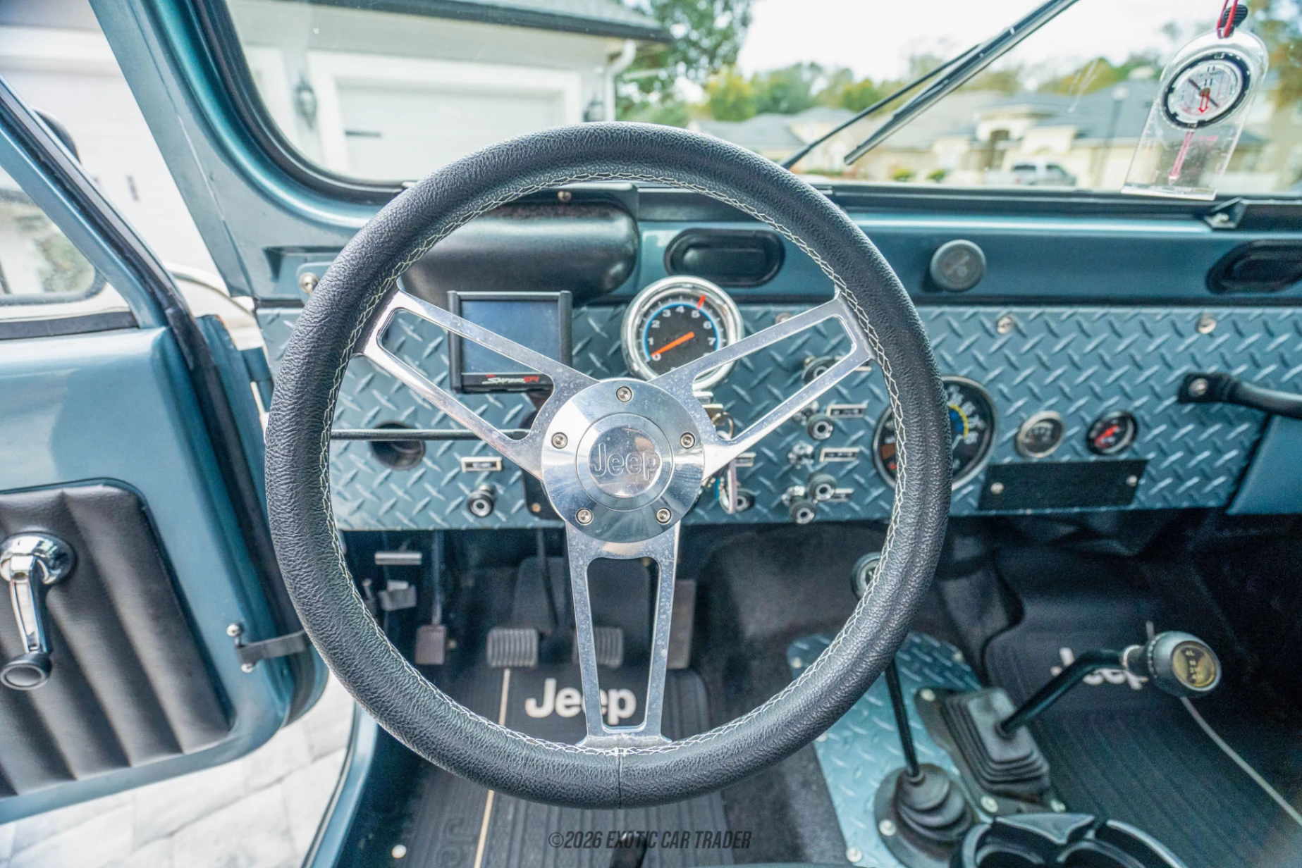 The pie-like headlights, vertical grille, and tall stance all add to the vehicle's unmistakable Jeep outlook. Finished in Teal Blue Metallic, our subject 1982 Jeep CJ-7 is beautifully maintained. The front of the Jeep is a heavy-duty double-tube black bull bar that keeps the bodywork protected from obstacles. An Apex Winch with a synthetic rope is behind this bull bar, ready to get you out of tough situations. This jeep rides on aluminum deep-dish wheels in the classic 8-hole modular style. These are wrapped with BFGoodrich All-Terrain T/A KO2 tires, providing you with optimal grip for any occasion. The iconic fold-down windshield lets you enjoy an open-air experience. The interior of this 1982 Jeep CJ-7 features high-back bucket seats. The dash boasts the classic center-mounted speedometer and auxiliary gauges. The three-spoke steering wheel, together with the classic twin-stick-style floor shifters, gives you a proper off-roading experience. The rear pickup area is fitted with a black bench seat with lap belts for more passengers.
