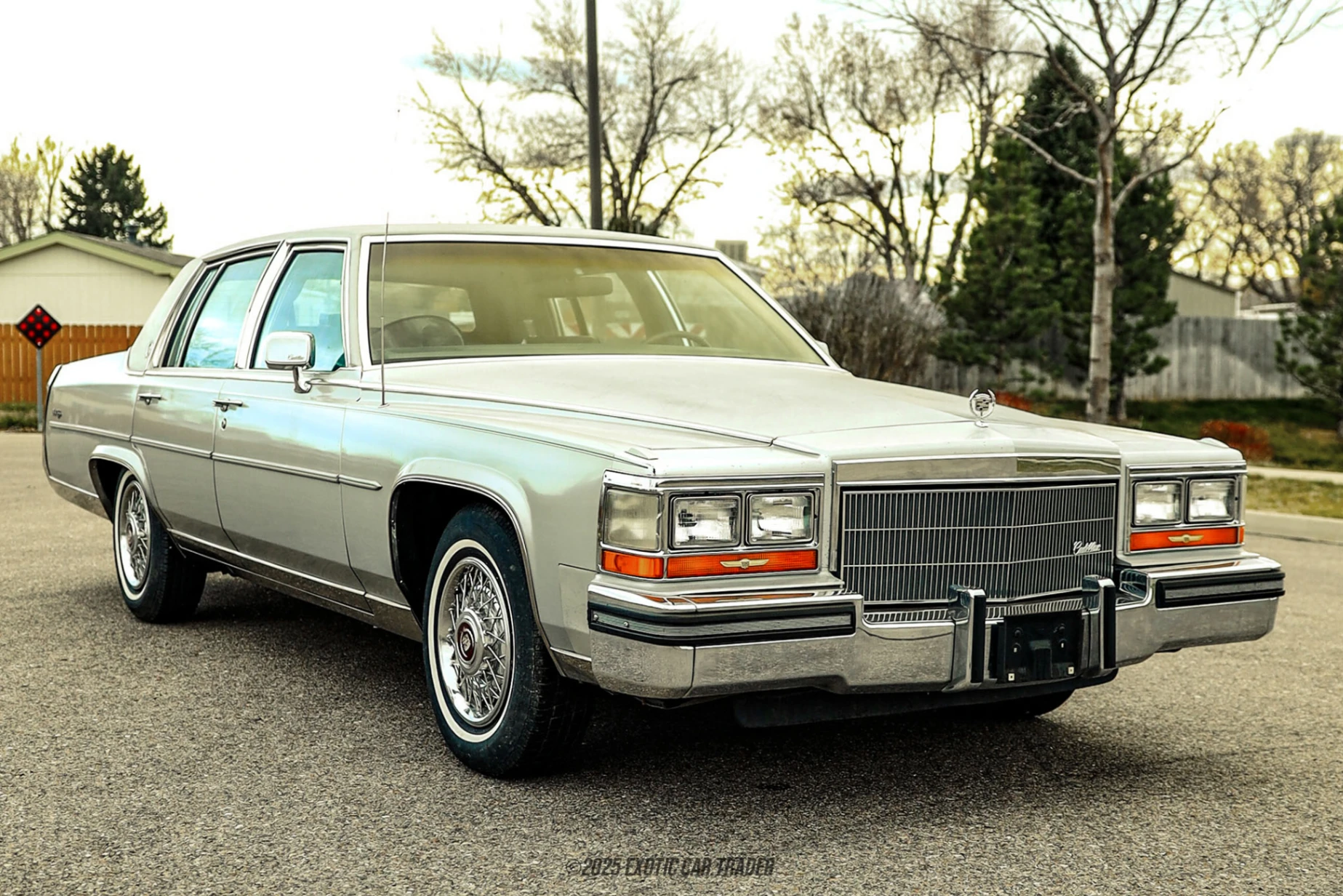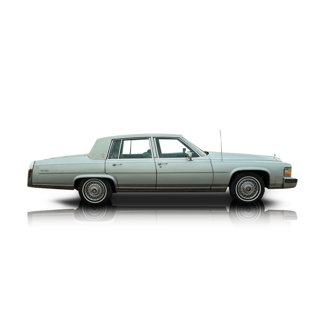 The exterior features the elegant square-body design with crisp chrome trim, color-keyed bumper fillers, cornering lamps, and the iconic upright grille. The original 15-inch wire wheel covers and whitewall tires complete the classic luxury look. Inside, the cabin is finished in blue leather with extensive faux walnut trim throughout the dash and doors. Cadillac’s Electronic Climate Control, Symphony Sound system, power accessories, tilt wheel, and illuminated entry system highlight the comfort-first approach. All interior controls, including the classic push-button HVAC and radio layout, present true 1980s Cadillac styling.