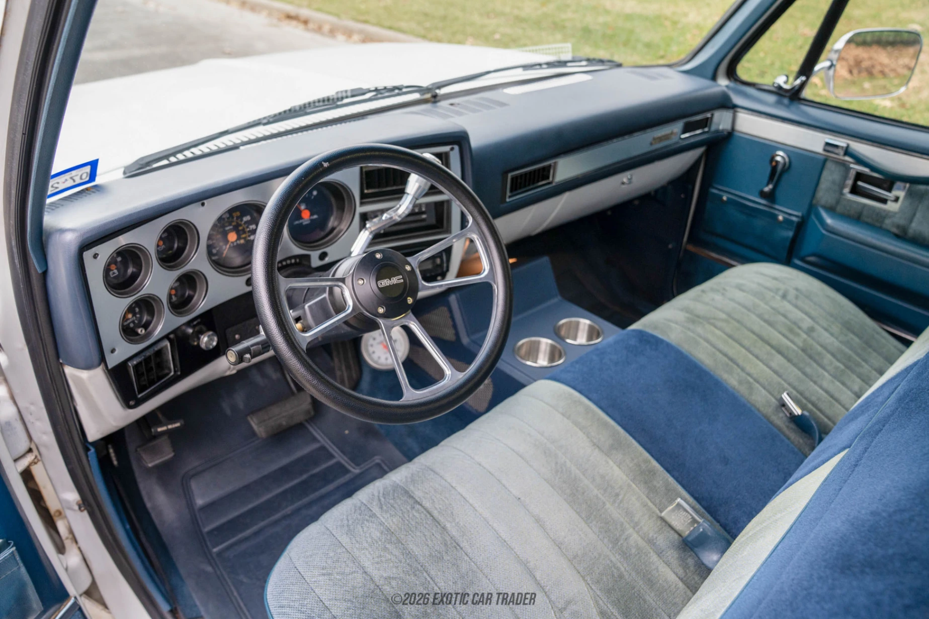 Mechanically, this Sierra Classic is powered by a blueprint crate 355ci naturally aspirated V8, fed by a four-barrel carburetor. The carbureted setup emphasizes mechanical simplicity, classic throttle response, and ease of service. Power is delivered to the rear wheels through a TH350 three-speed automatic transmission, a proven and durable drivetrain combination well suited to street driving. Aftermarket suspension components contribute to the lowered ride height and improved stance, while an aftermarket exhaust system enhances exhaust flow and sound. Overall, this configuration prioritizes reliability, strong low-end torque, and an engaging driving experience consistent with classic American pickup performance builds.