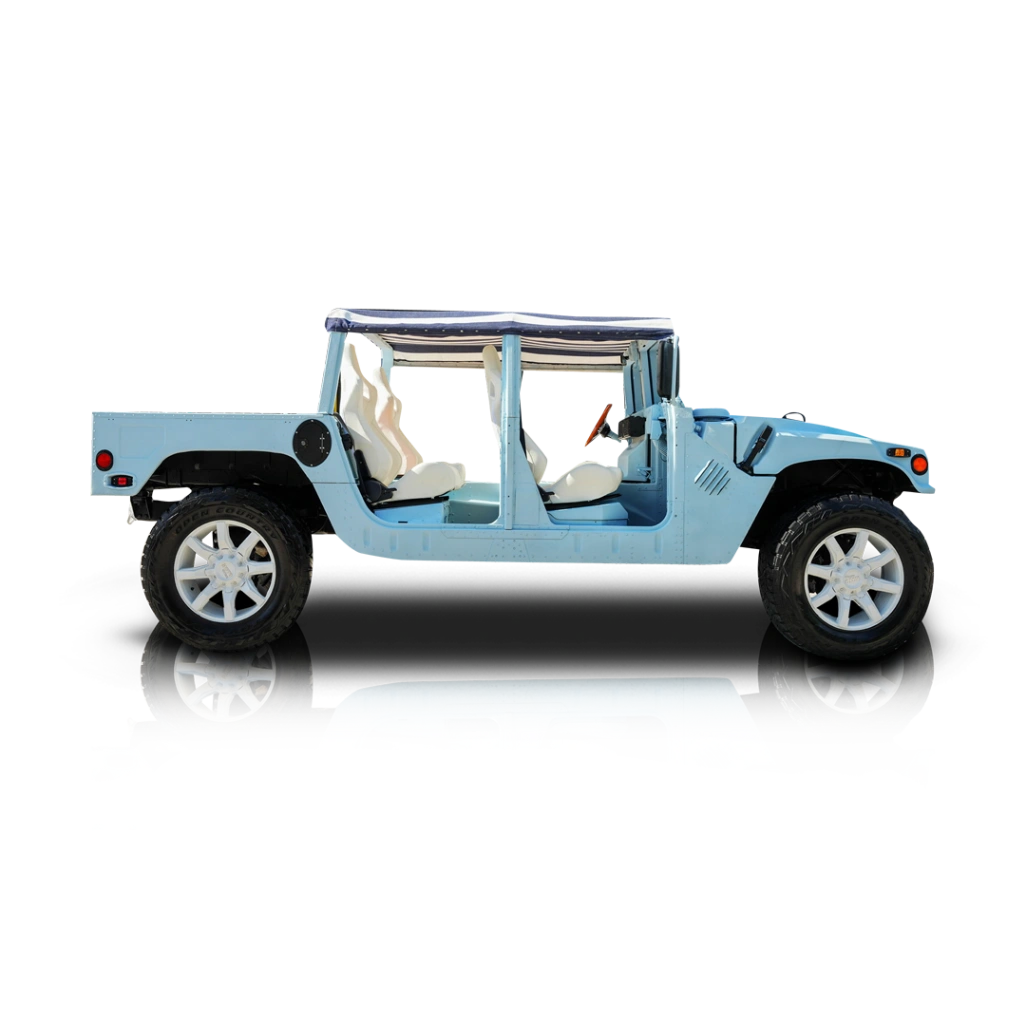 This 1987 AM General Humvee M998 bears a sunny persona thanks to its Tropical Blue paint job, its Moto Metal 20-inch wheels, and its Sunbrella navy and white custom top. As you’d notice, the doorless look grants you fantastic amounts of sunshine and fresh air while motoring along in this respected American off-roader that’s literally built to surmount mountains. It can still cut a fine off-road dash too, thanks to its Toyo Open Country 37-inch wheels. The vehicle has also been upgraded with LED lights and turn signals. Inside, you’ll find custom white bucket seat belts with sliders and 3-point safety belts to ensure that everyone is strapped in during more enthusiastic off-road forays. A custom aftermarket sound bar and speaker system ensures that everyone can have their share of good tunes, while the driver will be gripping an aftermarket woodgrain steering wheel and facing a bevy of digital gauges. However, the remainder of the vehicle’s interior still bears plenty of its military hallmarks, reminding everyone that this Humvee has led a distinguished life. The cargo area behind the rear seats features some nice wood planking, too.