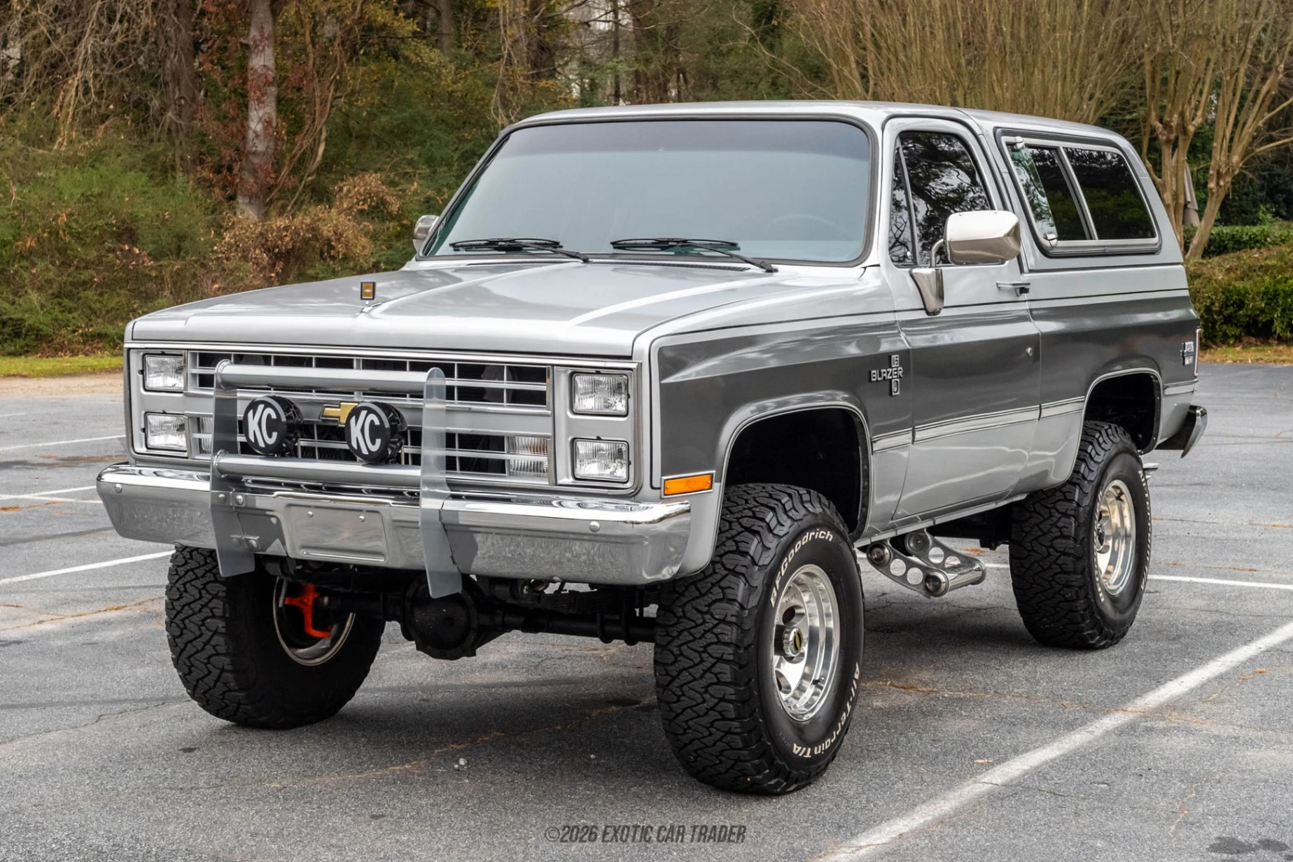 The exterior of this K5 Blazer Silverado presents a clean, modernized interpretation of the classic K5 silhouette, finished in a custom silver/gray vinyl wrap over the original blue paintwork. Aftermarket OEM-style front and rear bumpers maintain factory proportions, while functional upgrades such as a powder-coated Hickey bull bar, KC Gravity LED auxiliary lighting, Holley LED headlights and taillights, and Bully side steps enhance both utility and appearance. Mickey Thompson Classic 111 wheels in chrome are wrapped in aggressive 35x12.5R16 BFGoodrich KO3 tires, reinforcing the truck’s purposeful stance. Inside, the cabin has been fully reupholstered and upgraded in Dove Gray, featuring Katzkin leather seats, sound deadening throughout, aftermarket carpeting, an aftermarket headliner, and an aftermarket windshield. Modern instrumentation is provided by Dakota Digital RTX gauges, seamlessly integrating with the updated drivetrain. Audio quality is addressed with a Retrosound head unit, Focal Flax speakers, a JL Audio amplifier, and a JL Audio 10-inch subwoofer housed in a custom enclosure, delivering contemporary sound without compromising the classic aesthetic. Additional conveniences include air conditioning with a new compressor and a power rear window.