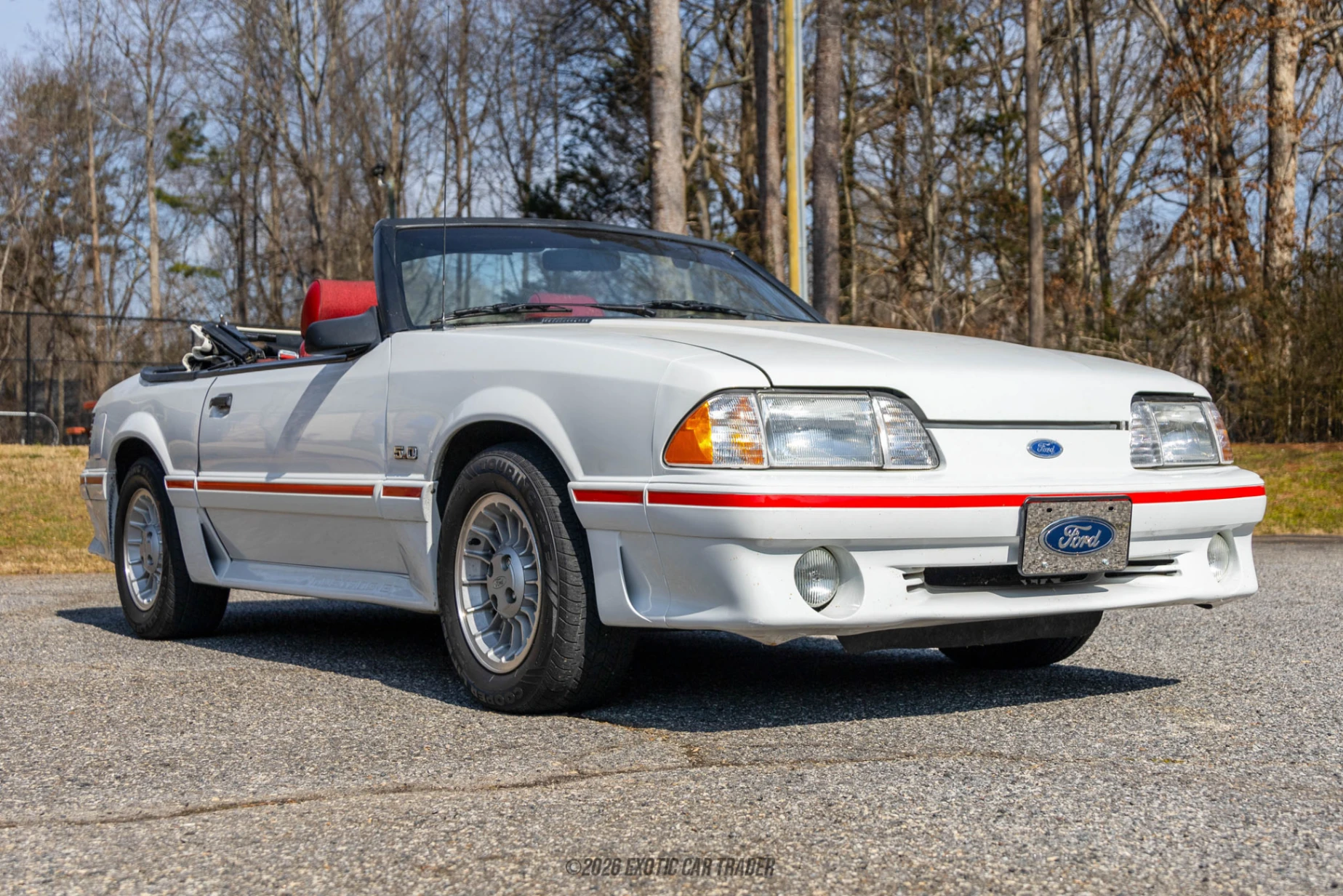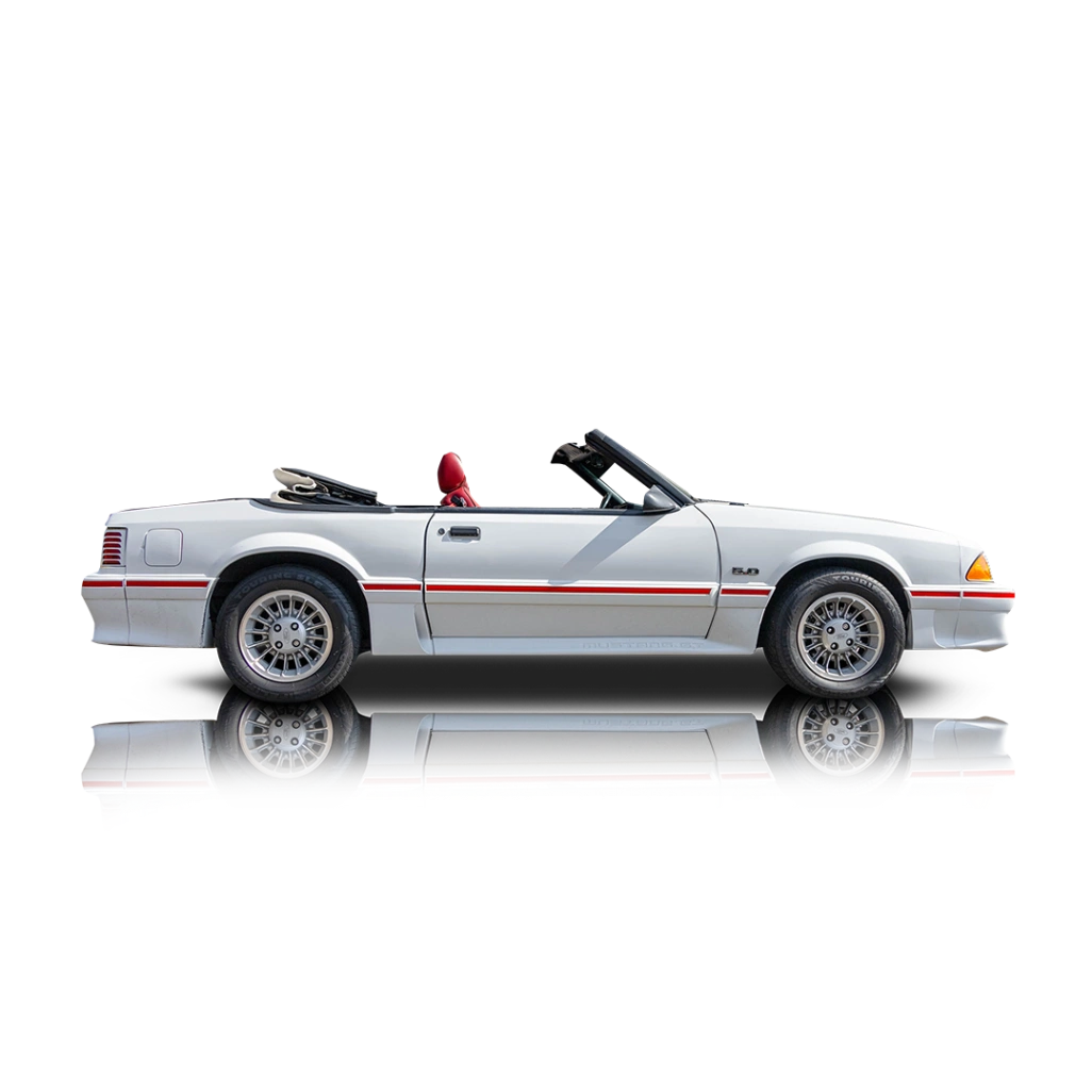 The exterior of this 1987 Ford Mustang GT Convertible is finished in Oxford White and showcases the distinctive GT aero treatment introduced with the refreshed 1987 front fascia. The integrated fog lights, sculpted lower air dam, body-color ground effects with “Mustang GT” embossing, and turbine-style 15-inch alloy wheels give the car its unmistakable stance. A period-correct red accent stripe runs along the lower body, tying beautifully into the Scarlet interior, while the white convertible soft top adds a clean, cohesive finish to the overall presentation. With the top down, the car embodies the classic Fox-body silhouette that defined an era of American performance. The interior of this 1987 Ford Mustang GT Convertible is finished in Scarlet Red cloth, creating a bold and unmistakably 1980s cockpit. Supportive bucket seats, a three-spoke factory steering wheel, and a straightforward analog gauge cluster emphasize its driver-focused design. The 5-speed manual shifter sits prominently in the center console, reinforcing the hands-on, mechanical feel enthusiasts love about these cars. Air conditioning, power steering, and a factory AM/FM cassette stereo provide comfort and convenience while preserving the authentic character of a true Fox-body GT.