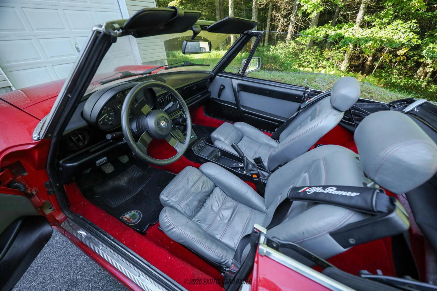 Is there a more perfect colour for a 1988 Alfa Romeo Spider Quadrifoglio than the brilliant shade of red this car sits in? The car sits close to the ground, with some impressively simple yet stylish 15-inch pepper-pot-style alloy wheels. Continuing the Italian theme, you’ll find the wheels are wrapped in Pirelli rubber. There’s a black convertible soft top, while a removable hard top cover is also included in the sale. Plus, the owner reports that the car features its original glass headlights. The interior is a snug and charming affair. Upholstered in Slate Grey, you’ll find grey leather seats with red stitching, and some deeply-cowled gauges. Blending originality with subtle enhancement. Modern comforts include an aftermarket JL Audio player with Bluetooth and a touchscreen dashboard with GPS and voice assist, making this Alfa better suited for contemporary driving without sacrificing its classic appeal.