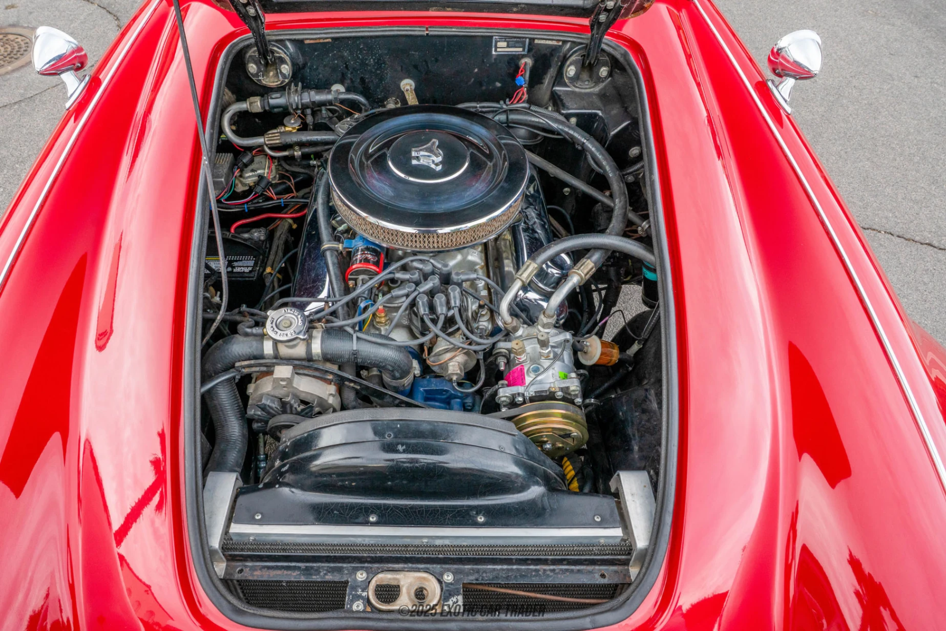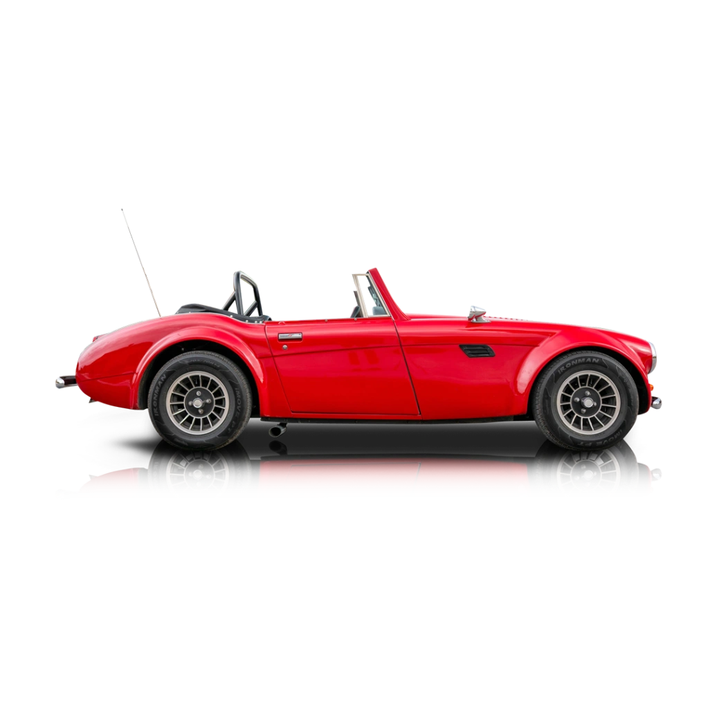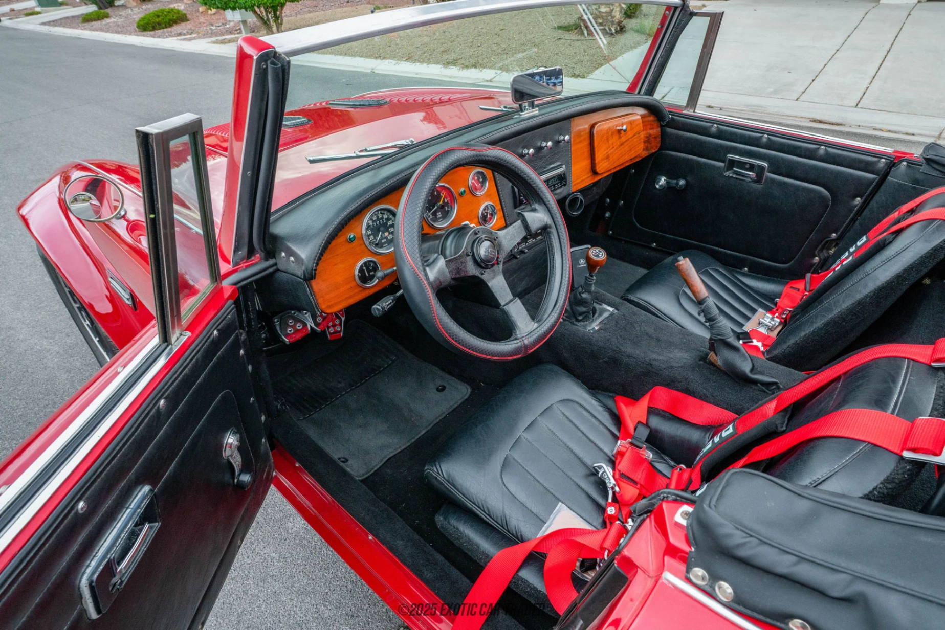 Finished in a vivid red with a black interior, the replica closely follows the lines of the famed Austin-Healey Sebring racers, enhanced with a louvered hood, chrome bumpers, and grille. Finned alloy wheels add a period-correct motorsport touch, while the removable red convertible hard top ensures versatility for open- or closed-air driving. Inside, a wood dashboard, leather-wrapped steering wheel, and black upholstery create a classic sports car environment that balances elegance with simplicity.