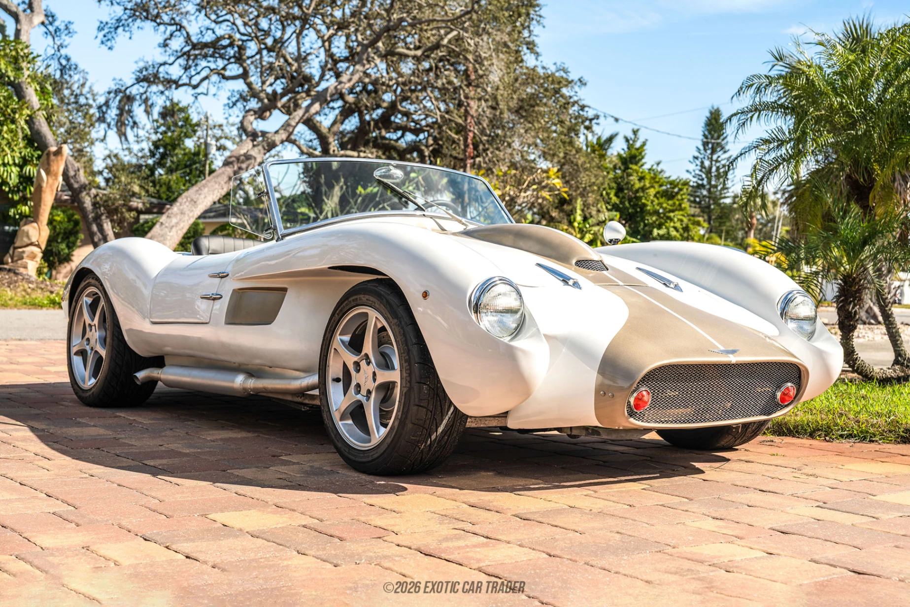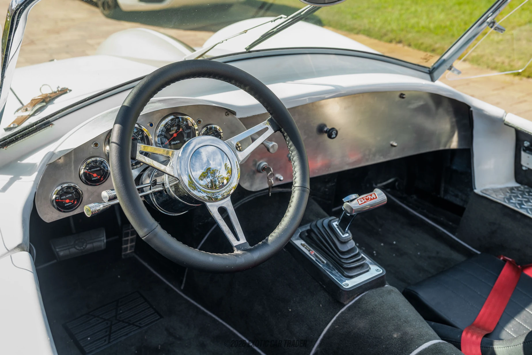 Finished in an elegant white and gold color scheme, the exterior emphasizes long-hood, short-deck proportions and a minimalist open-top roadster silhouette. Subtle details such as the oval front grille, sculpted fenders, and side-exit exhaust reinforce the period-inspired aesthetic. Corvette-style alloy wheels complete the stance, balancing classic design with modern hardware. Inside, the cabin features a tan Naugahyde interior that maintains a simple, driver-focused layout. An aluminum dashboard houses AutoMeter gauges, while a B&M floor-mounted shifter and functional controls reflect the car’s performance-oriented intent rather than luxury excess.