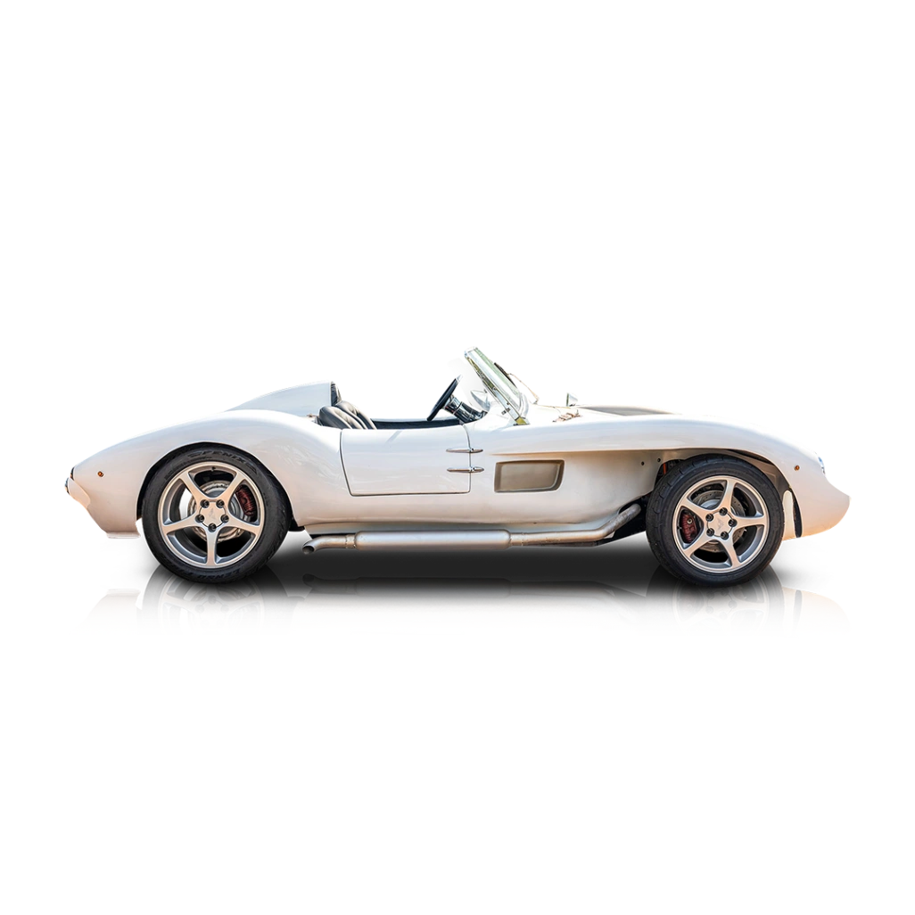 Power is provided by a 400ci Chevrolet small-block V8, naturally aspirated and equipped with an Edelbrock carburetor and aftermarket headers. The engine is paired with an automatic transmission, operated via a B&M floor-mounted shifter, sending power to the rear wheels. Built on a rectangular steel tube frame utilizing C4 Corvette underpinnings, the car benefits from power steering, double wishbone front suspension, coilover suspension, and power disc brakes. Ceramic-style side-exit exhaust routing enhances both visual impact and auditory character, resulting in a mechanically straightforward yet engaging roadster that combines classic inspiration with dependable modern components.