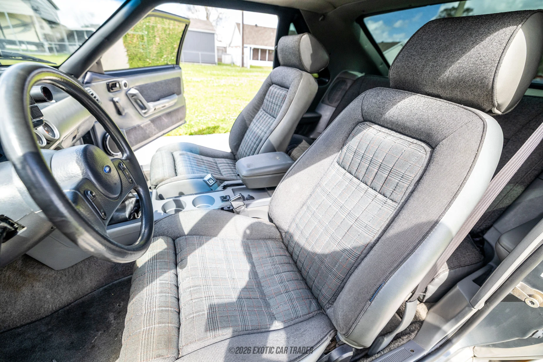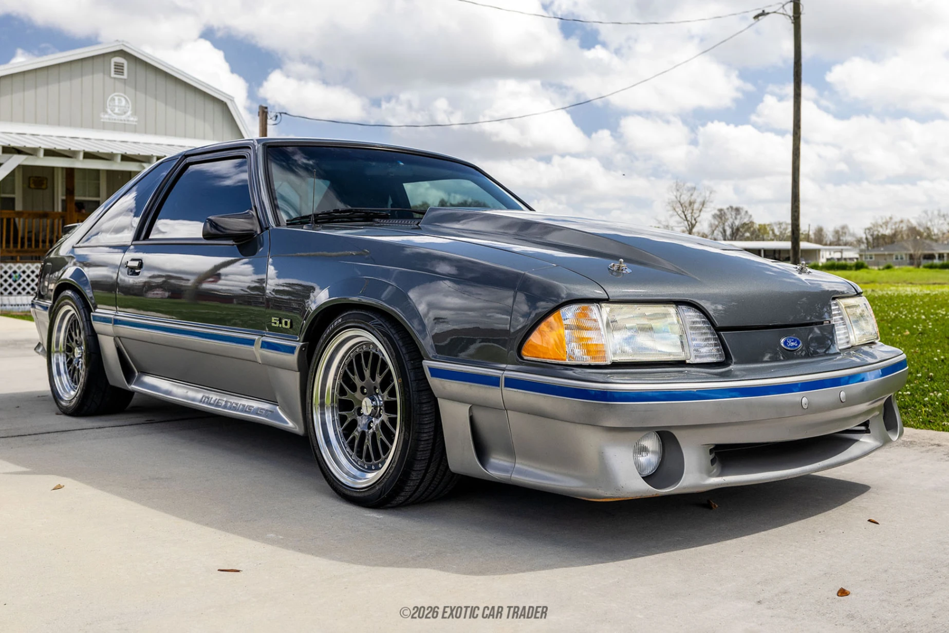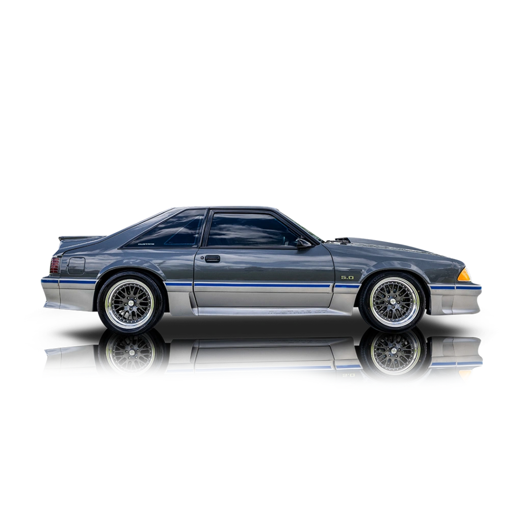 The exterior of this 1988 Ford Mustang GT features the unmistakable angular styling that defined the Fox-body era. Finished in Dark Shadow Blue Metallic with contrasting silver lower cladding, the car carries a custom two-tone appearance that highlights its aggressive stance. A raised hood scoop hints at the forced-induction power beneath the hood, while wider aftermarket wheels and modern performance tires give the car a planted and purposeful look. Upgrades such as the SVE 5-lug conversion and four-wheel disc brakes modernize both the braking capability and wheel fitment options, complementing the performance-focused character of the build. The interior of this 1988 Ford Mustang GT retains the classic Fox-body layout and is reported by the seller to present in 9 out of 10 condition. The cabin features Medium Gray articulated cloth sport seats, a signature feature of the GT trim that provides improved support during spirited driving. A center console with integrated cup holders adds convenience, while an upgraded sound system with dual amplifiers and subwoofer setup provides modern audio performance. The overall cabin maintains the original character of the Fox platform while benefiting from tasteful updates that improve everyday usability.