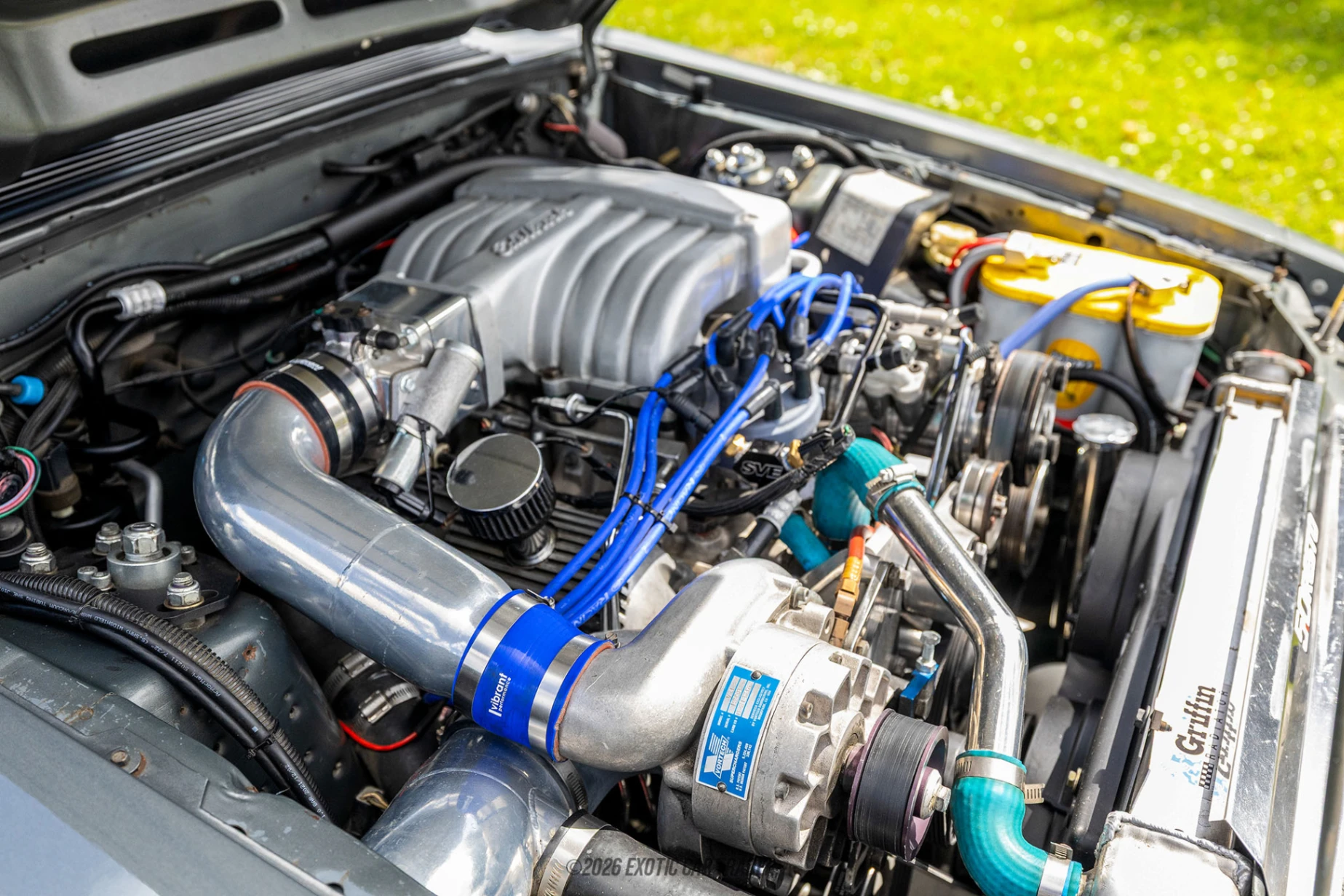 Under the hood of this 1988 Ford Mustang GT is a heavily upgraded 5.0-liter supercharged V8 built to handle serious performance. The engine features forged internal components and is equipped with Edelbrock performance intake components, helping improve airflow and efficiency throughout the powerband. Forced induction comes from a Vortech VS-1 centrifugal supercharger producing approximately 13 pounds of boost, resulting in a reported 488 horsepower at the rear wheels. Supporting upgrades include an aluminum radiator, SVE electric fan kit, and Dakota Digital controller to help maintain proper operating temperatures. Power is delivered to the rear wheels through a Tremec 5-speed manual transmission, replacing the car’s original automatic setup, and is paired with an aluminum driveshaft and firewall-adjustable clutch, making this Fox-body Mustang a significantly more capable performance machine than its factory configuration.