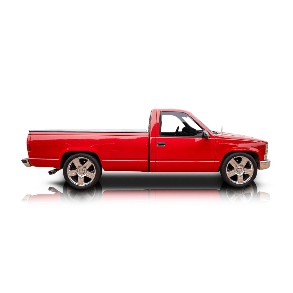Finished in a vibrant Red with a contrasting Black interior, this Sierra blends classic utility with a customized, modern aesthetic. The exterior features a short-bed configuration accented by a sleek tonneau cover and chrome bumpers. Adding to its aggressive stance is a set of 22-inch six-spoke chrome wheels that give this vintage pickup a contemporary "street truck" look. To ensure these large-diameter wheels sit perfectly in the wheel wells, the truck has been treated to an aftermarket lowering suspension kit, providing a leveled and more athletic profile without sacrificing its iconic silhouette.