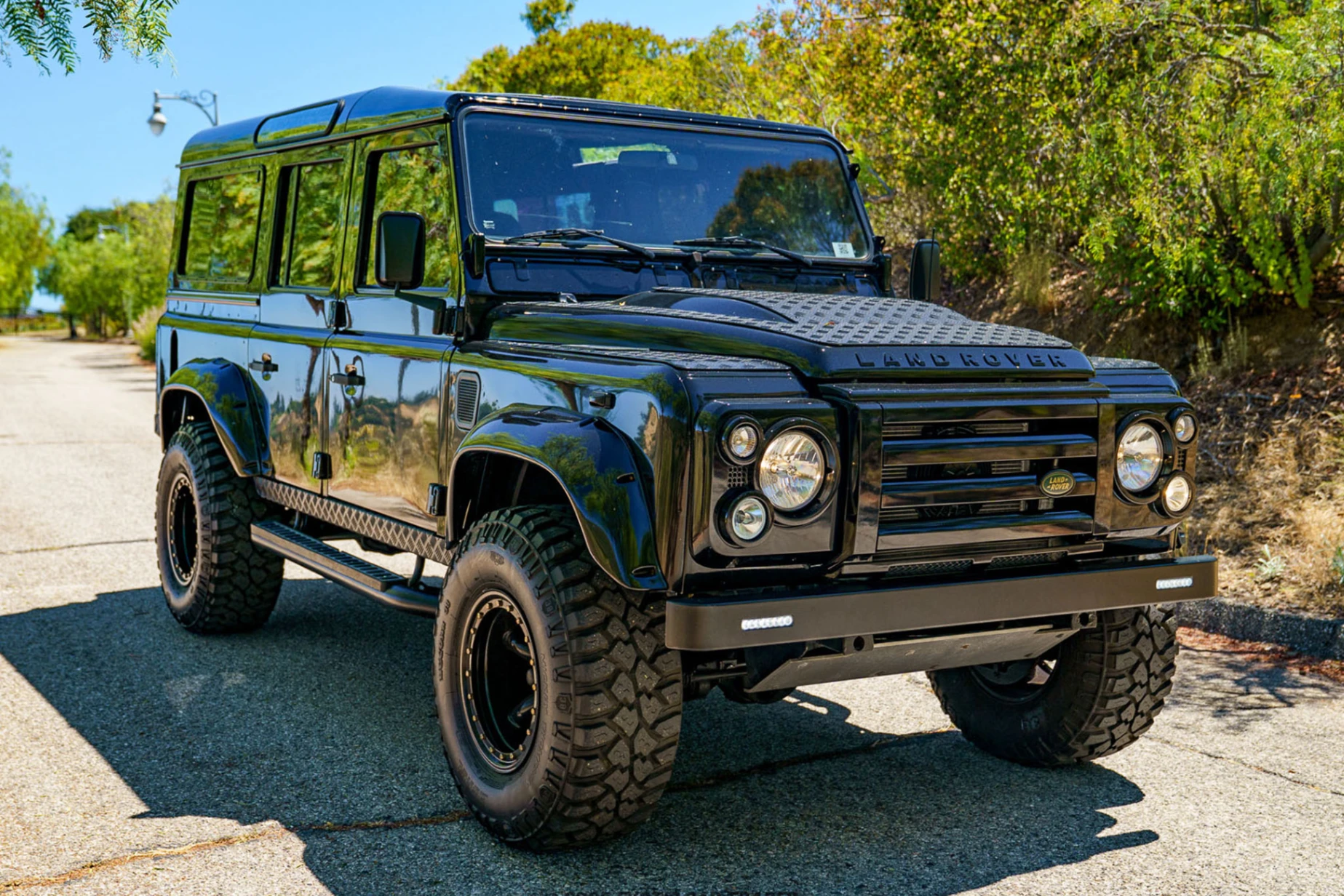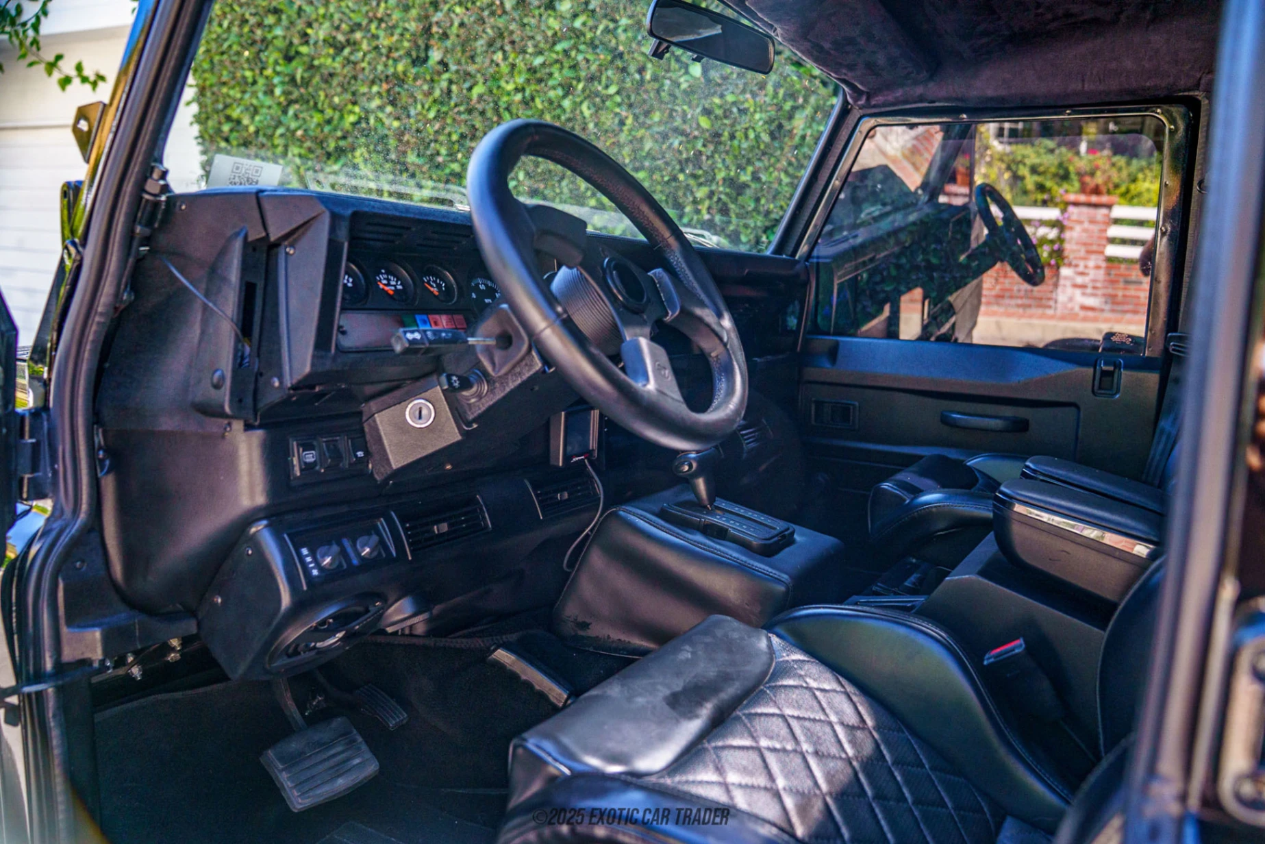The Land Rover Defender is an unmistakable vehicle with an iconic silhouette that is distinct in every way. It’s an off roader with a design that speaks to the adventurous utilitarian and the urban minimalist at the same time. The boxy design brings a commanding road presence, and the black exterior only enhances the appeal. Circling around the vehicle, you’ll notice that this Defender sits slightly higher than normal thanks to the 3.5” lift and the upgraded Fox suspension and coils. Black Mickey Thompson wheels fit into the rugged aesthetic of the Defender, along with the aftermarket front grille. Special LED lighting in the custom front bumper adds to the upgraded LED lighting in the front, while the rear also comes with upgraded LED lighting and a custom bumper with a tow hitch. Climbing inside is easy thanks to the side steps that were upgraded, revealing a black interior that retains the classic aesthetic that was before, with some changes. This includes comfortable Recaro seats with custom diamond stitching, suede headlining, and custom carpeting. A Momo-style steering wheel provides plenty of grip for handling better, and the custom sound system with 10” LCD touch system is a joy. There’s even upgraded air conditioning for the front and rear.