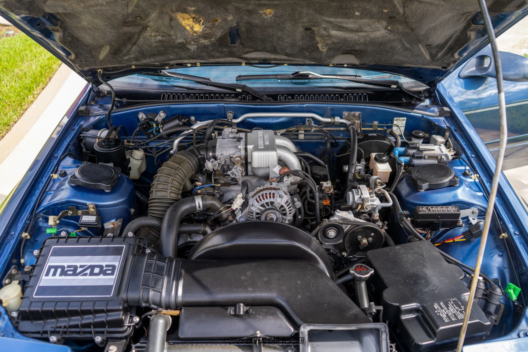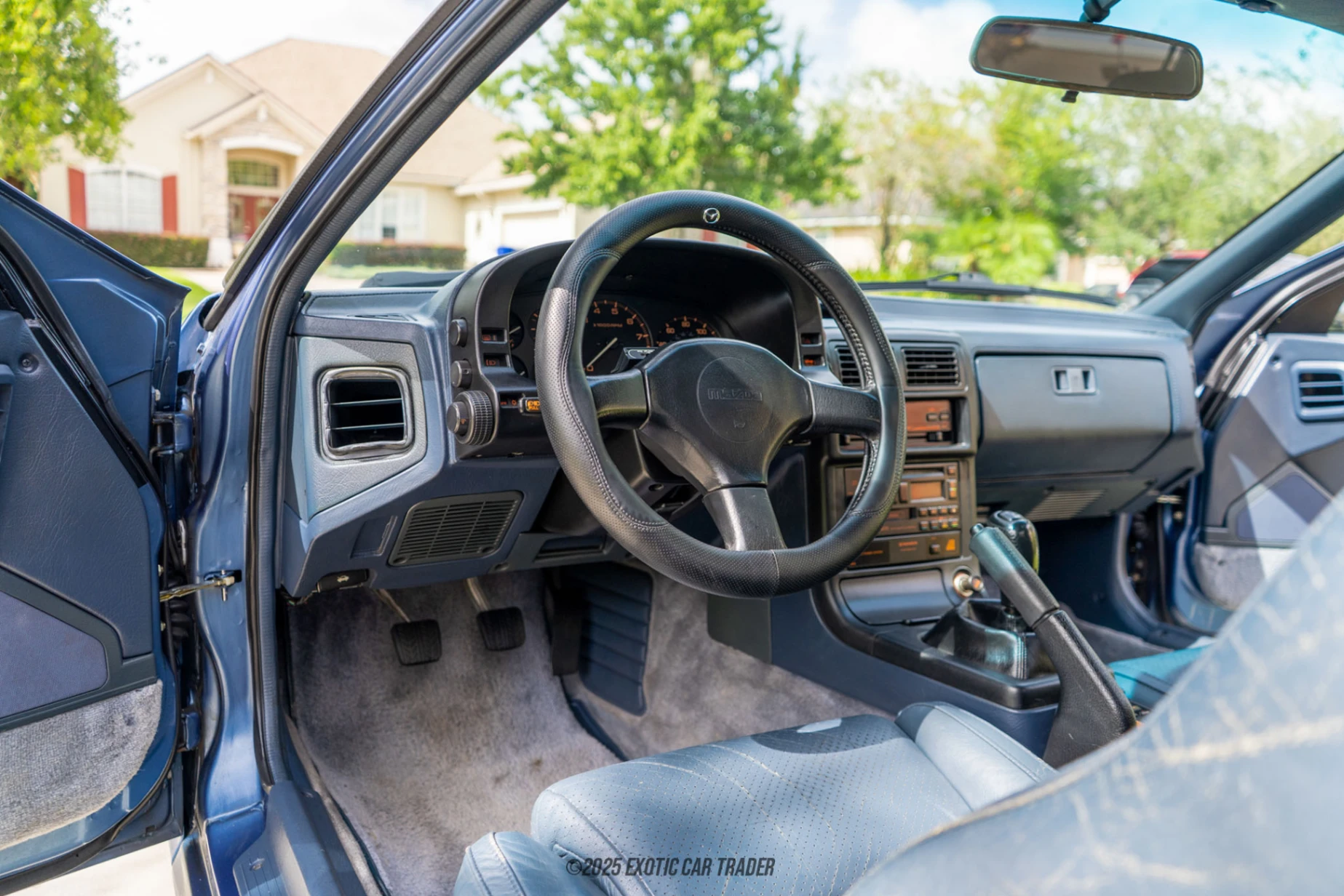 This third-generation 1989 Mazda RX-7 Convertible is a beauty to behold, with its quintessential Eighties wedge-shaped styling and of course, pop-up headlamps! Fun Fact: all three generations did have pop-up headlamps. This car’s black convertible top is power operated for ease of use, and it’s got a lovely set of multi-spoke alloy wheels to ride on. You’ll also no doubt notice the car’s twin exhaust pipes and dainty rear spoiler. The interior of this 1989 Mazda RX-7 Convertible is a two-seat affair featuring blue leather upholstered seats for two adults. You’ve got fully functional air conditioning, which is a great thing in an ever-warming world. The car also comes with power windows, power mirrors and of course, that powered convertible top. Its sound system is another object of Eighties beauty, a lovely three-in-one head unit that combines AM/FM radio functions with a CD player, plus a cassette tape player. Made by Pioneer, the unit even includes headrest-mounted speakers with their own controls in the lower center console! And if that isn’t enough, gazing at the car’s pure analog gauge cluster with its centrally-located, 8,000rpm-redlined tachometer is definitely exhilarating.