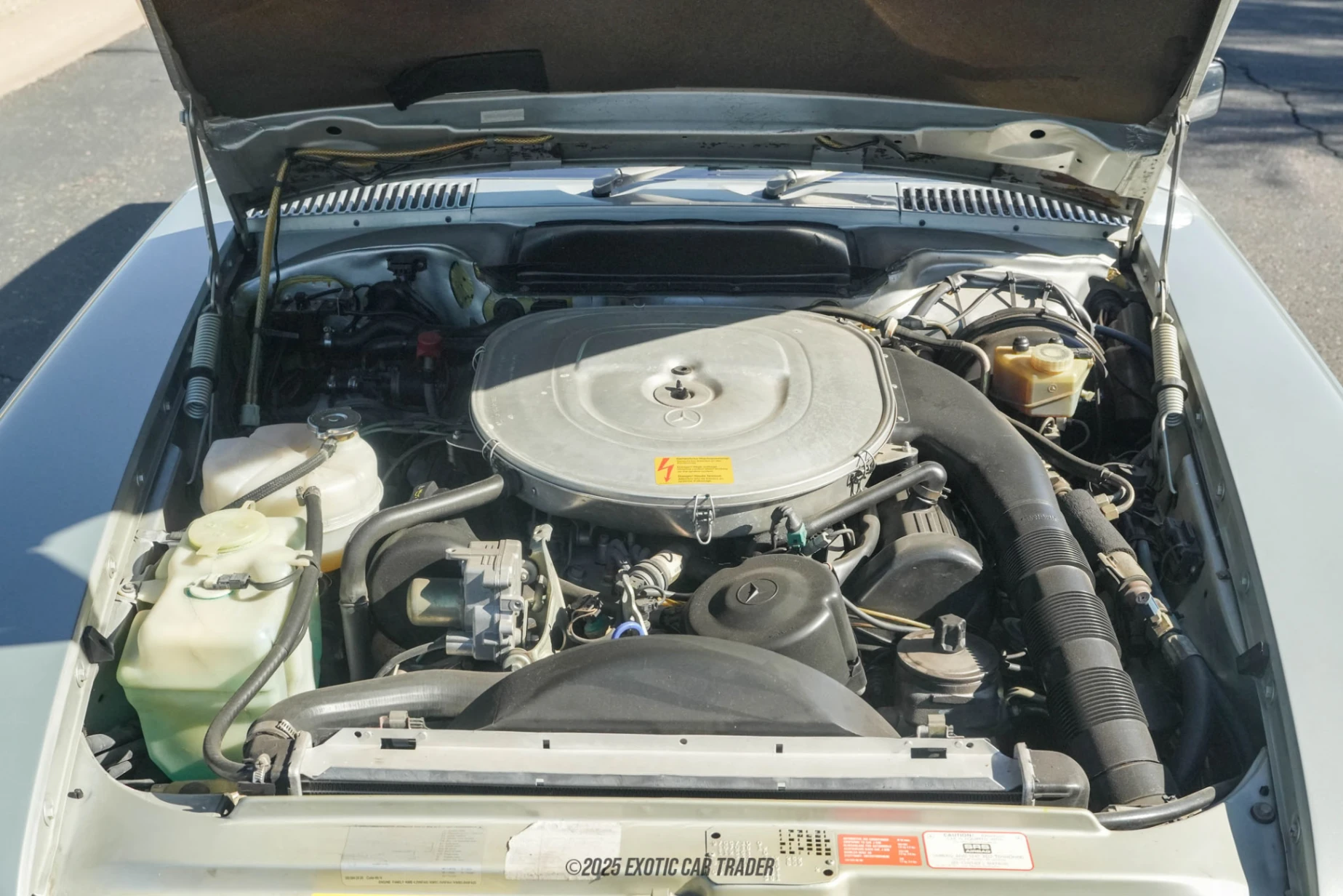 Power comes from the 5.6L M117 V8 with Bosch KE-Jetronic EFI, paired to a 4-Speed Automatic, providing smooth torque delivery and the robust reliability the late R107 models are known for. The engine bay displays factory-correct components including the air cleaner housing, accessory drive layout, ABS system, and emissions equipment consistent with 1989 specifications. Supported by power-assisted steering and 4-wheel disc brakes, this drivetrain offers relaxed cruising manners and confident performance, making the 560SL one of the most refined and enjoyable classic Mercedes grand tourers.