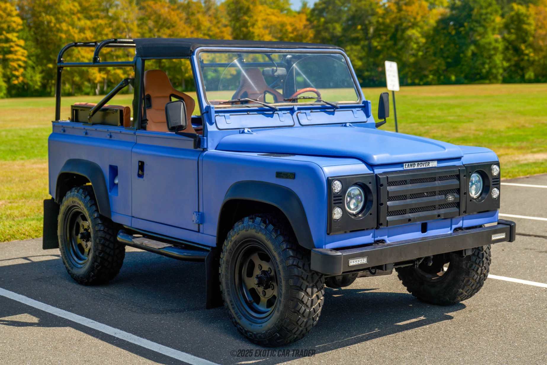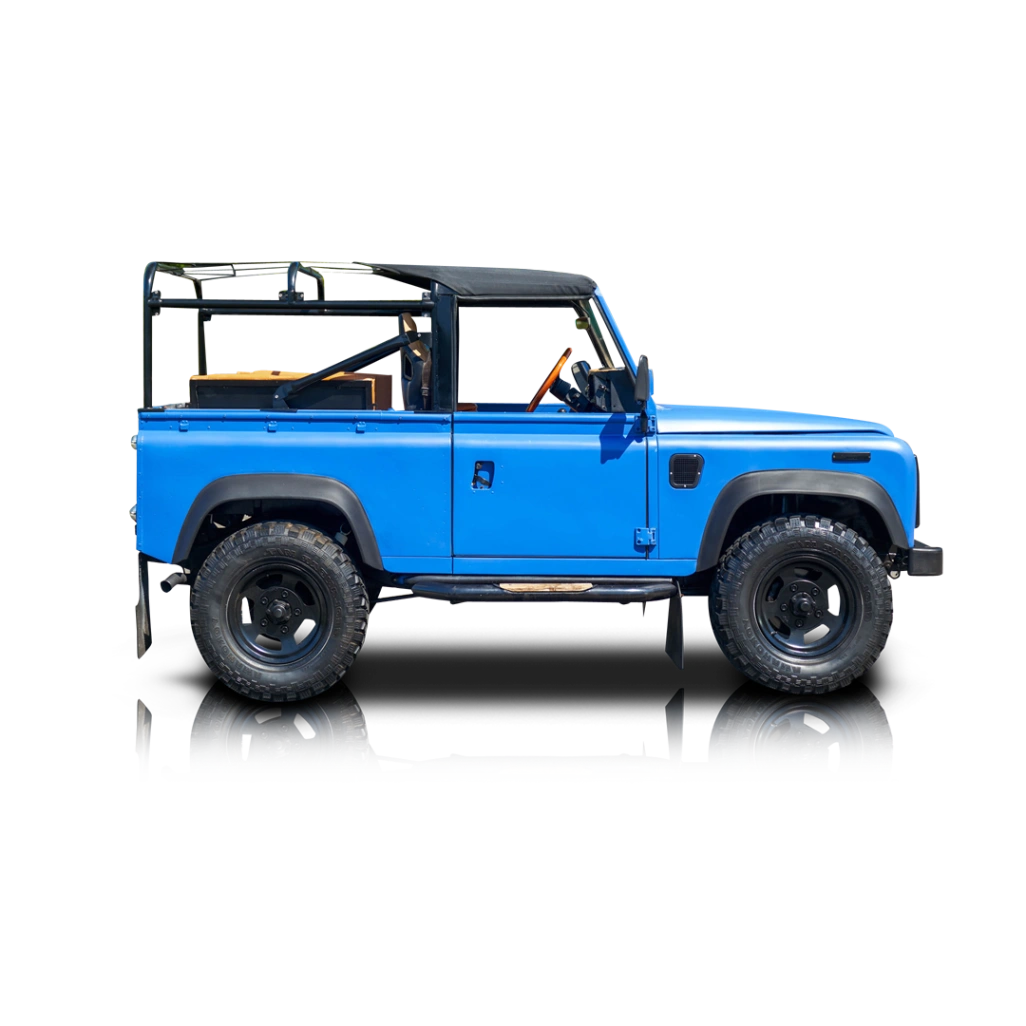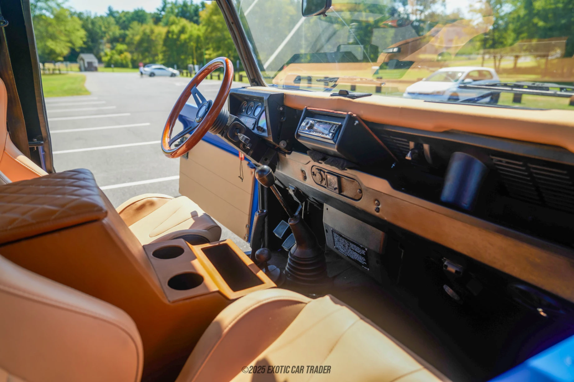 Finished in a matte blue exterior, this Defender 90 projects a purposeful and adventurous presence. Black 16-inch wheels with 32-inch oversized Yokohama tires reinforce its off-road capability while complementing the rugged aesthetic. Inside, the cabin has been upgraded with a mix of functionality and bespoke detail: front leather and carbon fiber sport bucket seats provide support, rear leather bench seats retain practicality, and a custom diamond-stitched leather center console adds a handcrafted element. Black carpeting and a rear wood floor enhance the presentation, while an aftermarket steering wheel and Bluetooth-enabled audio player modernize the driving environment.