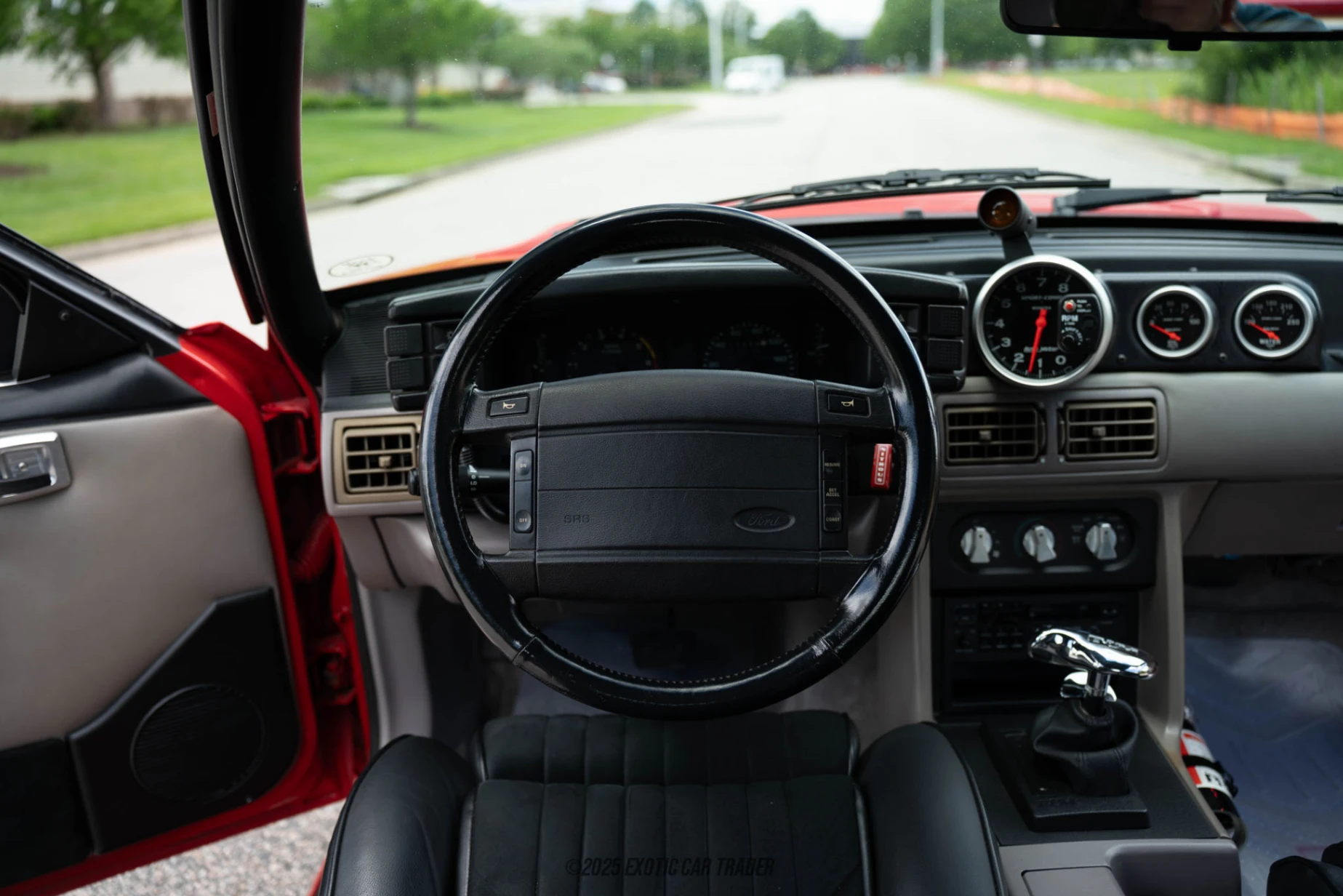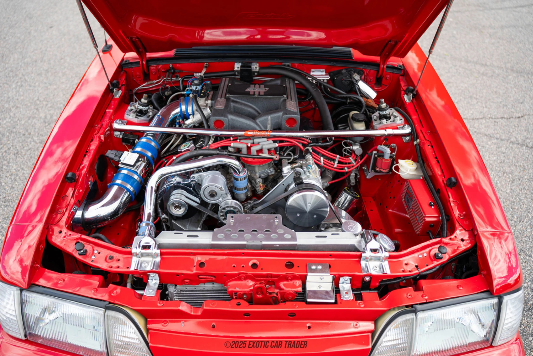 Classic muscle styling cues were not going to cut it in the 80s; there were much-needed changes required to keep the Mustang running strong. The answer to a massive shift in customer preferences? The Fox body Mustang design. This 1991 Ford Mustang GT sports a red exterior that takes its styling cues up a notch. With many Fox bodies seeing rough lives, it's clear that this classic pony car is in excellent shape, with its exterior trim intact. For wheels, this '90s muscle car sits low and just right with a set of uber cool chrome wheels. The aggressive and spicy exterior makes way for a cabin that provides just enough comfort to cruise in style and rocket off the drag strip as well. Step in and you are treated to a black leather interior of this 1991 Ford Mustang GT that is home to a host of upgrades which include a gauge pod to keep track of this machine's performance, comfortable bucket seats at the front for an added sporty feel, and a remote bottle opener. Make your way to the rear and you'll find nitrous and this machine's battery rerouted to the trunk.