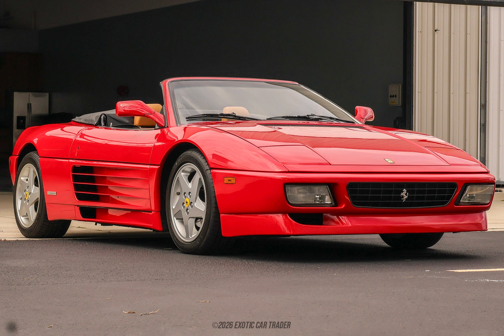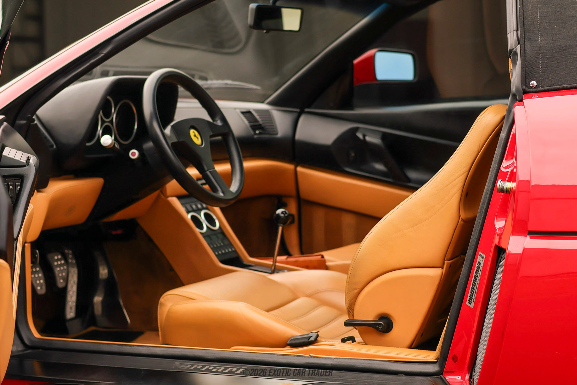 The exterior of this 1994 Ferrari 348 Spider is finished in Rosso Corsa, Ferrari’s signature red that perfectly complements the car’s sharp, angular Pininfarina design. Distinctive features such as the straked side intakes, pop-up headlights, and wide rear stance give the 348 an unmistakable presence. The black convertible soft top provides a clean contrast and allows for open-air driving, enhancing the car’s exotic appeal. Sitting on classic 17-inch 5-spoke alloy wheels, this Spider maintains an authentic and period-correct look that continues to turn heads. The interior of this 1994 Ferrari 348 Spider is upholstered in Cuoio leather, offering a warm and luxurious contrast to the bold exterior. The cabin has been reupholstered, giving it a refreshed appearance while maintaining its original character. At the center of the driving experience is the iconic gated manual shifter, a defining feature of classic Ferraris that delivers a tactile and engaging feel with every gear change. The driver-focused cockpit, simple controls, and analog gauges emphasize the purist nature of this mid-engine sports car.