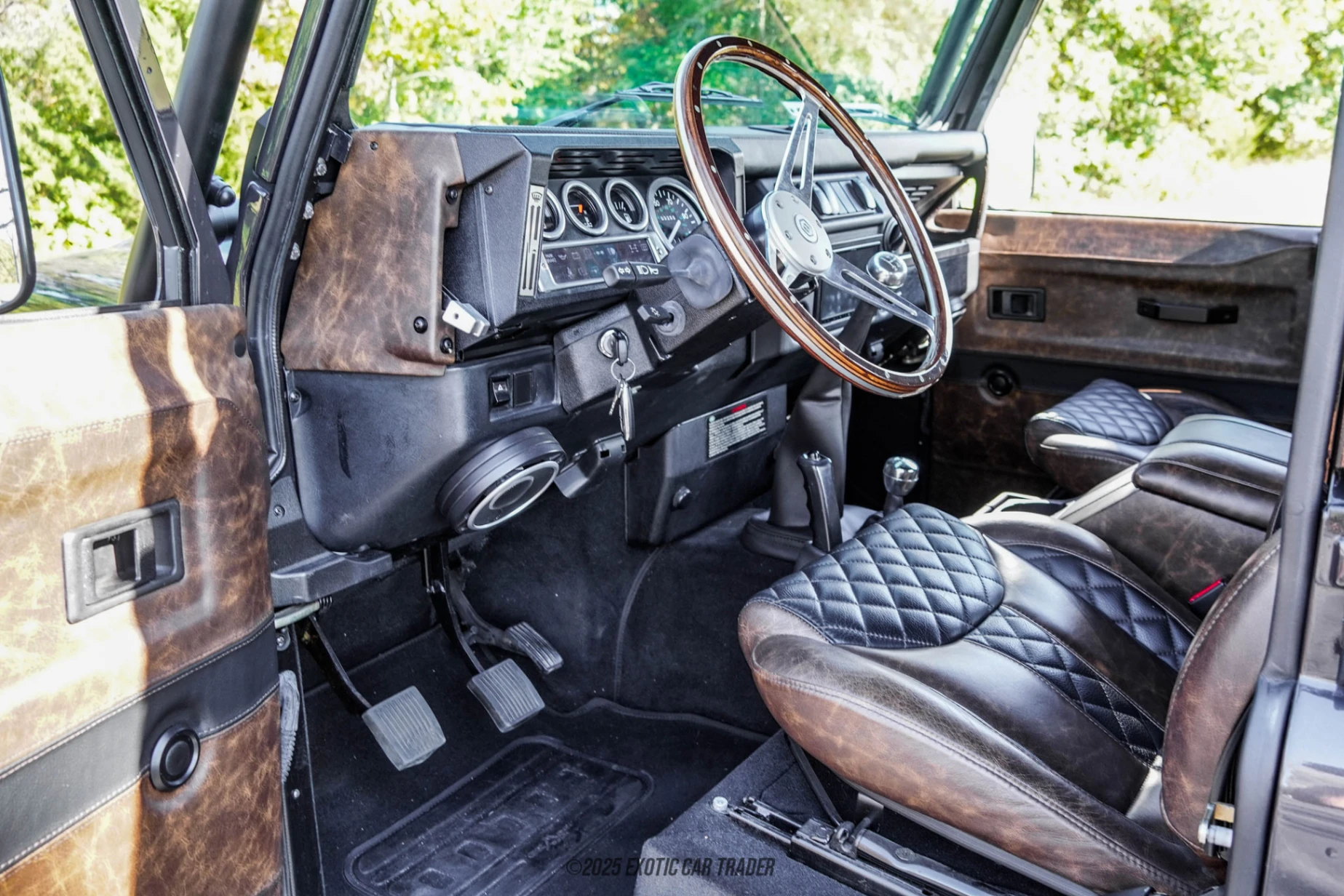 Finished in a sophisticated gray, the exterior of this Defender strikes the ideal balance between rugged and refined. Subtle enhancements like Helderburg’s custom door and windscreen hinges, LED headlights with daytime running rings, and a soft-top internal rail system elevate both form and function. The vehicle rides on 16-inch custom-painted steel wheels wrapped in BF Goodrich KM3 Mud Terrain tires, while locking differentials and Fox performance suspension hint at its serious trail capability. Step inside and you're met with a handcrafted interior that wouldn’t be out of place in a high-end European GT. The brown and black Italian leather seats feature quilted Mulliner-style stitching, bringing a level of detail rarely seen in off-road builds. Marine-grade mahogany and caulk line the cargo floor and doors, giving the cabin a yacht-inspired feel. The LED instrument cluster, grab handles, and modern Helderburg Hi-Fi Focal sound system with Apple CarPlay complete the interior's blend of analog charm and modern tech. Heating and air conditioning are standard, making this Defender usable year-round.
