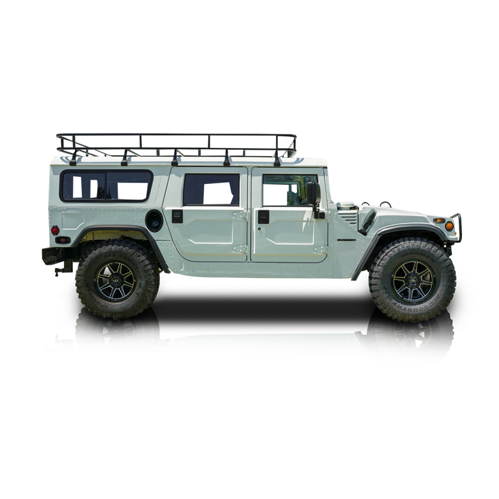 The exterior of this Hummer H1 is finished in a clean white, which complements its imposing and eye-catching design. Inside, the cabin features a comfortable tan cloth interior that enhances the ruggedness of the vehicle while providing a touch of warmth. The vehicle also includes a roof rack, ideal for additional storage during adventures. Motiv off-road wheels paired with oversized tires give this vehicle an aggressive stance, further amplifying its off-road capabilities and making it suitable for varied terrains.