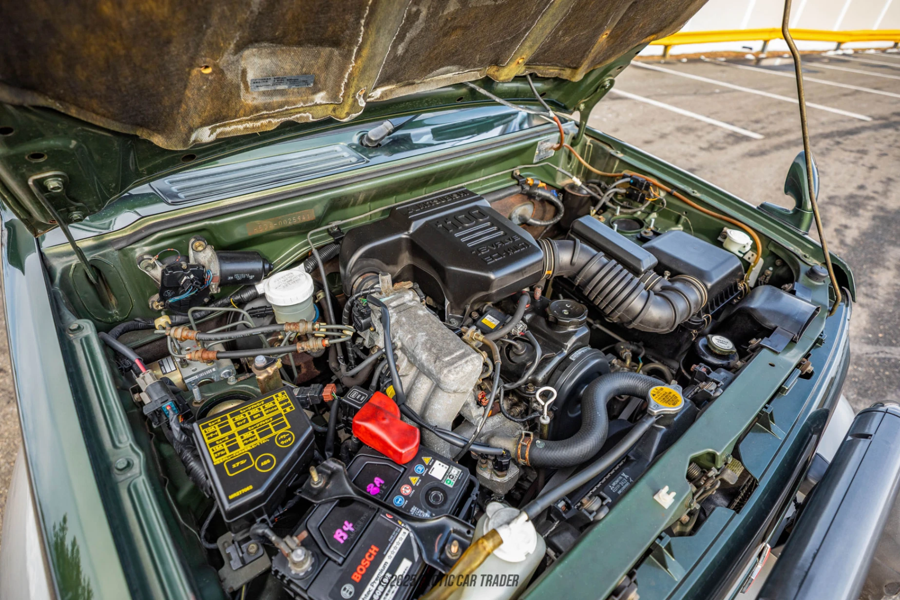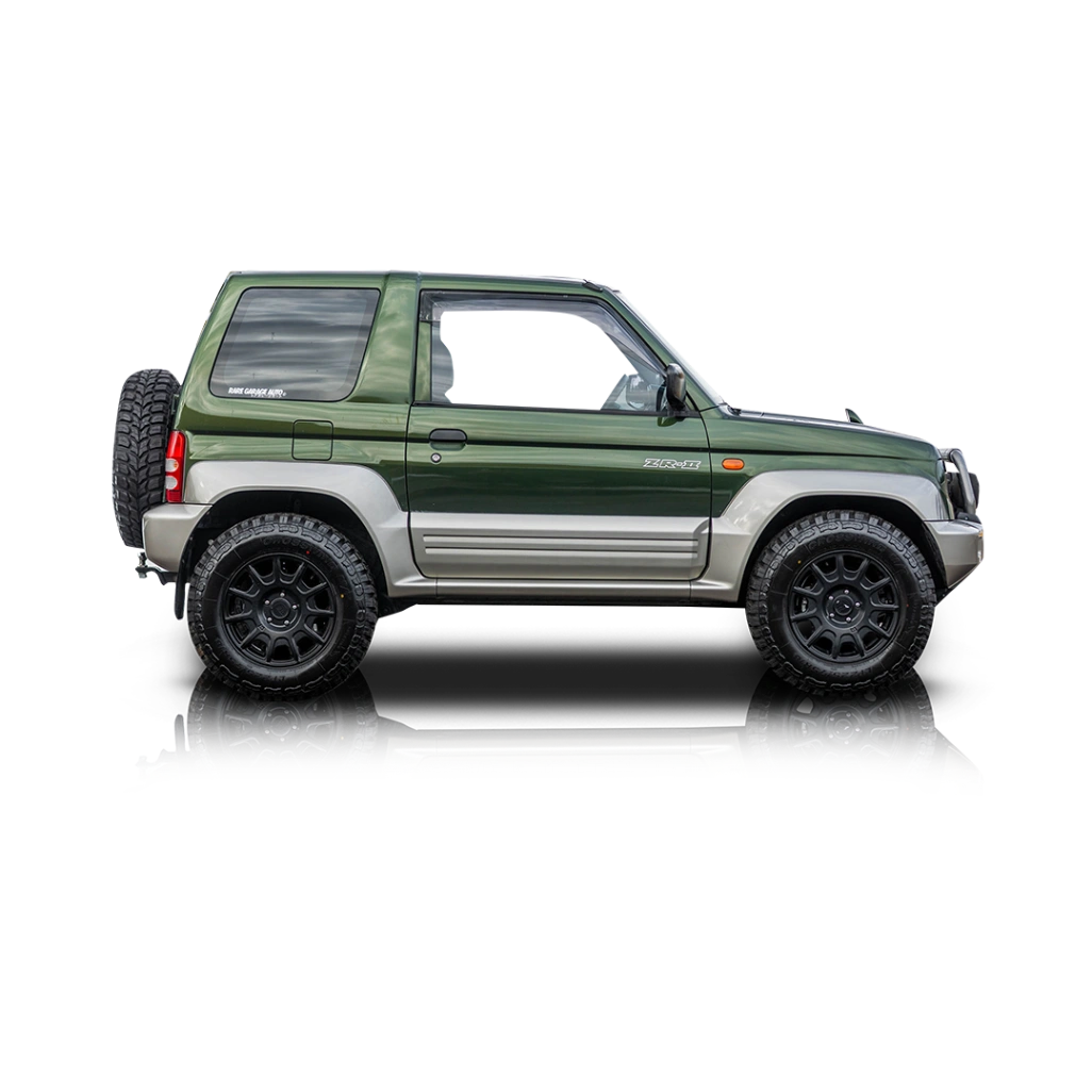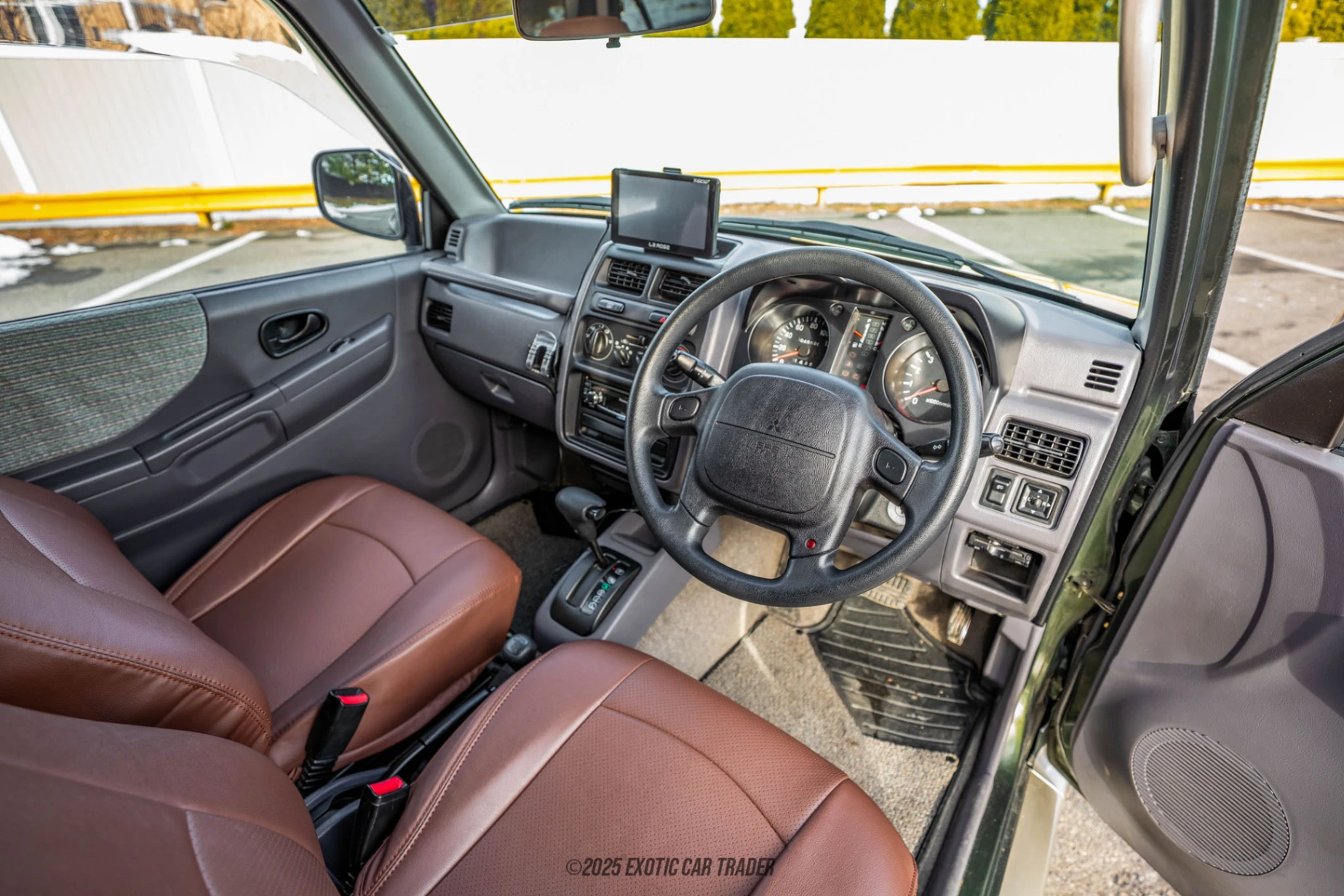 Power is supplied by a 1.1-liter inline-four engine, naturally aspirated and equipped with factory multi-point fuel injection, delivering smooth and reliable performance for urban driving and light off-road use. A 4-speed automatic transmission sends power through a part-time 4WD system, allowing the driver to select between rear-wheel drive and four-wheel drive for added traction on snow, gravel, or loose surfaces. While it does not feature a low-range transfer case, the Pajero Junior’s lightweight chassis, independent front suspension, and solid rear axle give it confident road manners and surprising capability for its class.
