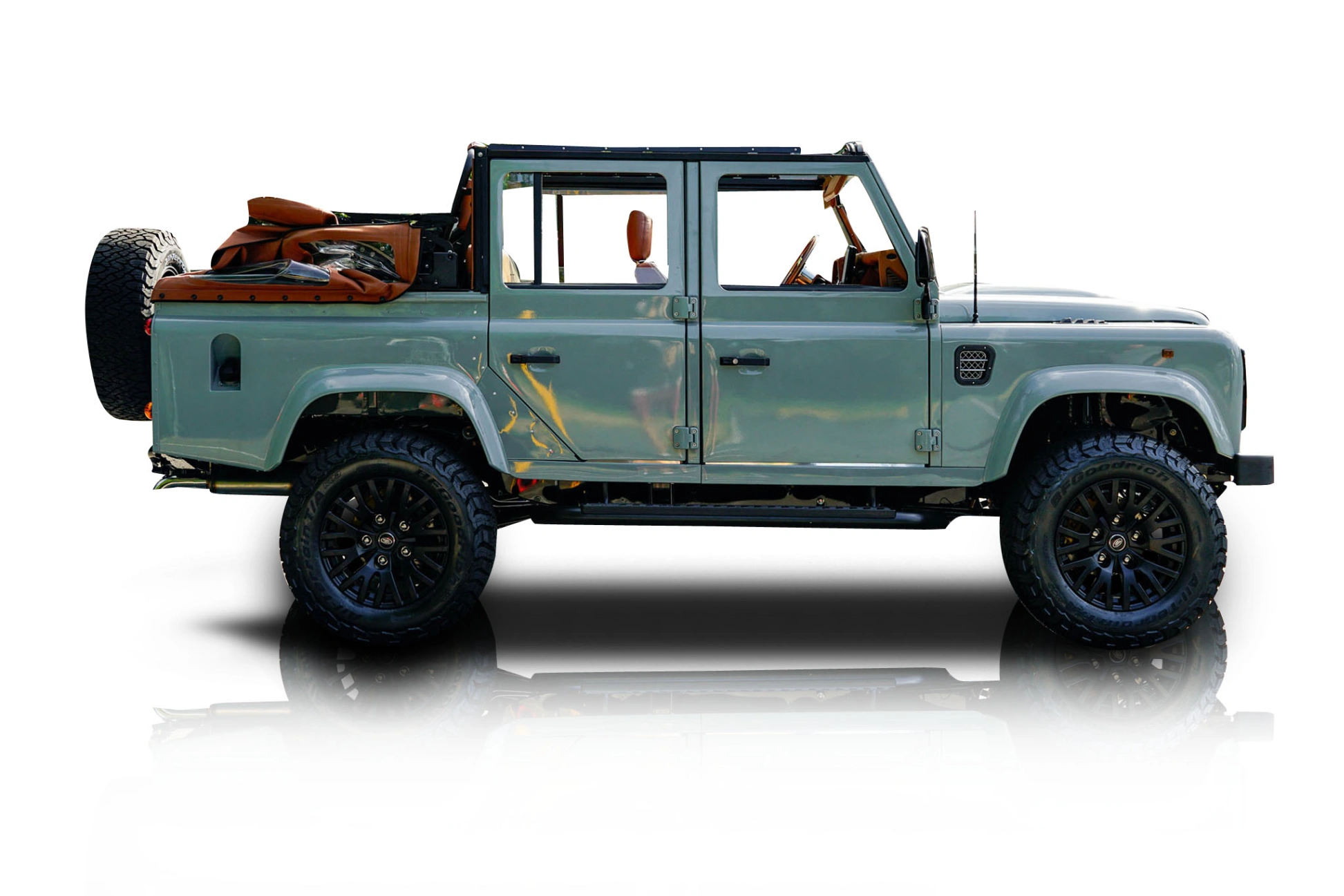 Save for its tan convertible top which is power operated, the rest of this 1997 Land Rover Defender 110’s body panels wear a coat of gray paint. With its NAS-style rear bumper, PUMA hood and custom LED lighting, this is definitely an off-roader from the outset. Its 2-inch lift, custom-designed safety bar and 18-inch wheels are further symbols of strength. Meanwhile, all five doors enjoy a galvanized frame for better longevity. The custom diamond-stitched leather interior of this 1997 Land Rover Defender 110 is a truly awesome place to be. It’s got air conditioning, an upgraded heater system, a post-2007 steering column, power windows, LED lighting for all four cup holders, wood trim, and a 11-inch BOSS audio system with USB input. You’ve also got a sports steering wheel, front and rear speakers, and even a push-button selector for the vehicle’s upgraded automatic gearbox. Aftermarket white-faced gauges have been installed too, while the cargo area has been suitably carpeted and awaits your luggage.