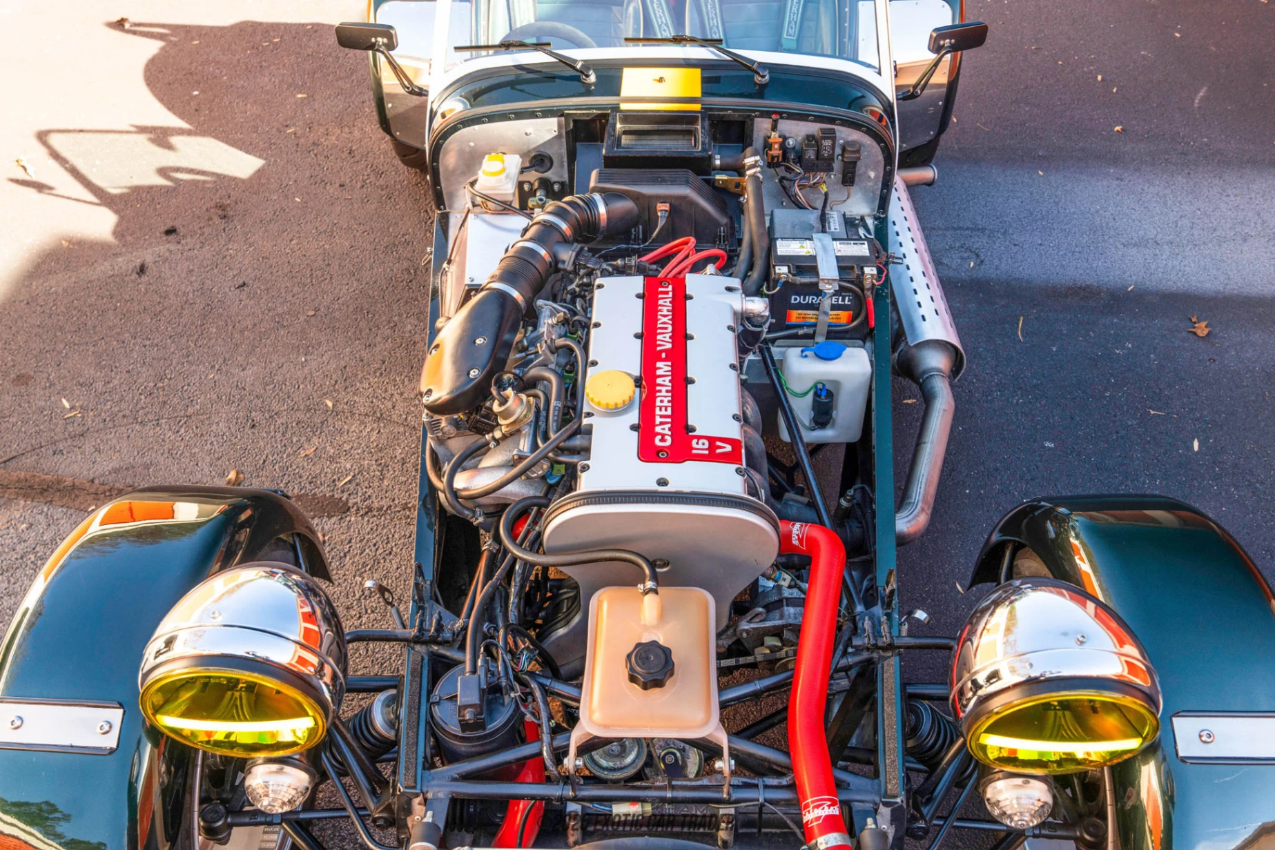 Now here’s something that’s rarer in the United States than a Bugatti, Pagani, Koenigsegg or any other limited-volume supercar. A Caterham 7. One look at our photos and you’ll see that it’s nothing like anything we have over here. This is the epitome of lightweight British open-topped motoring. This particular 1998 Caterham Super 7 comes to you from Atlanta and has done 28,000 miles so far. It’s got a Vauxhall 2.0-liter Red Top four-cylinder engine to move it, as well as a 5-speed manual transmission. It also features a set of KN 16-inch lightweight alloy wheels.