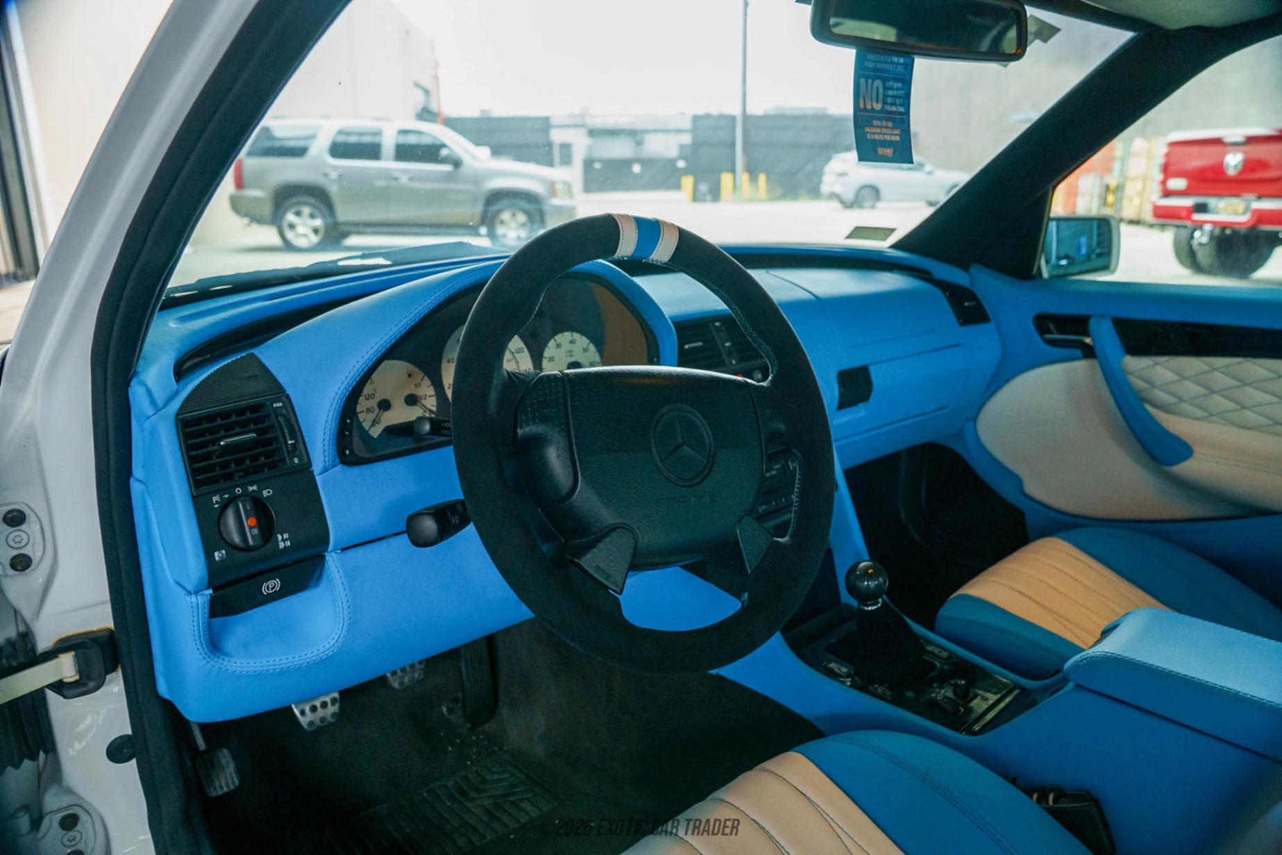 This 1998 Mercedes-Benz C43 DTM looks stunning with its aforementioned body kit, its two-tone white and black paintwork, and large silver alloy wheels. The car is instantly identifiable as a W202 C-Class as its base too so nobody will try to claim that it’s a kit car or some unknown foreign thing. The interior of this 1998 Mercedes-Benz C43 DTM remains stock with features such as seating for five adults, climate control, power windows and Mercedes-Benz branded radio with cassette player. But its been reupholstered in a fetching Porsche Riviera blue and white theme to match the overall outrageous factor of this car. The leather is reportedly imported from Italy.