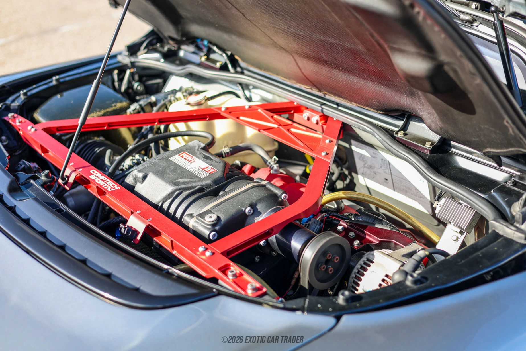 This 1999 Acura NSX-T has a 3.2-liter V6 behind the passenger cell. Yes, it’s a mid-engined machine, just like a supercar should be. Normally the engine would be naturally aspirated, but this car has been given a dealer-installed Comptech supercharger kit! Power still goes to the rear wheels via a 6-speed manual transmission. You’ll also see some carbon fiber engine components for that added bit of visual drama, as well as some modest weight savings.