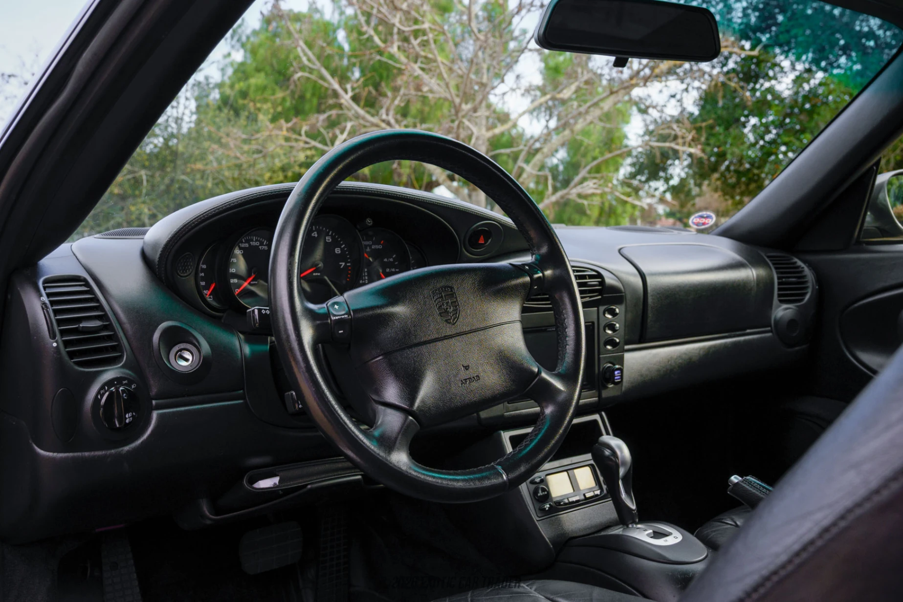 The exterior of this 2000 Porsche 911 Carrera features a striking Slate Gray Metallic finish, complementing its classic design language. The sleek contours and aerodynamic profile contribute to its sporty stance. Stepping inside, drivers are greeted by a high-quality black leather interior that exudes sophistication. The cabin is fitted with soft look leather seats, providing comfort on every drive, while the dual power seat package ensures an effortless adjustment for optimal driving posture. The interior also includes thoughtful amenities, such as headlight washers and an on-board computer, enhancing the driving experience with both style and functionality.