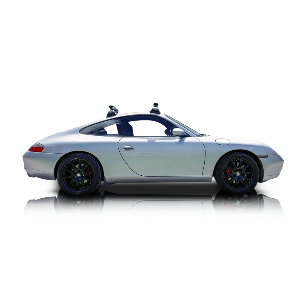 The exterior of this 2001 Porsche 911 Carrera 4 Coupe is finished in Arctic Silver Metallic, a timeless Porsche color that complements the smooth, rounded design of the 996 generation. This example features aftermarket wheels that give the car a more aggressive stance, while the inclusion of the original wheels adds flexibility for future ownership. Tinted windows, headlights, and taillights contribute to a sleeker, more modern appearance, and the addition of a roof rack system adds a layer of practicality rarely seen on a 911. Overall, the car maintains its iconic silhouette while incorporating subtle custom touches. The interior of this 2001 Porsche 911 Carrera 4 Coupe is trimmed in black leather and has been upgraded with a Kenwood touchscreen head unit featuring Bluetooth connectivity, bringing modern convenience to the cabin. The layout remains driver-focused, with clear instrumentation and intuitive controls typical of Porsche design. The cabin offers a comfortable yet sporty environment, suitable for both spirited drives and longer journeys, while the updated infotainment system enhances daily usability without compromising the car’s original character.
