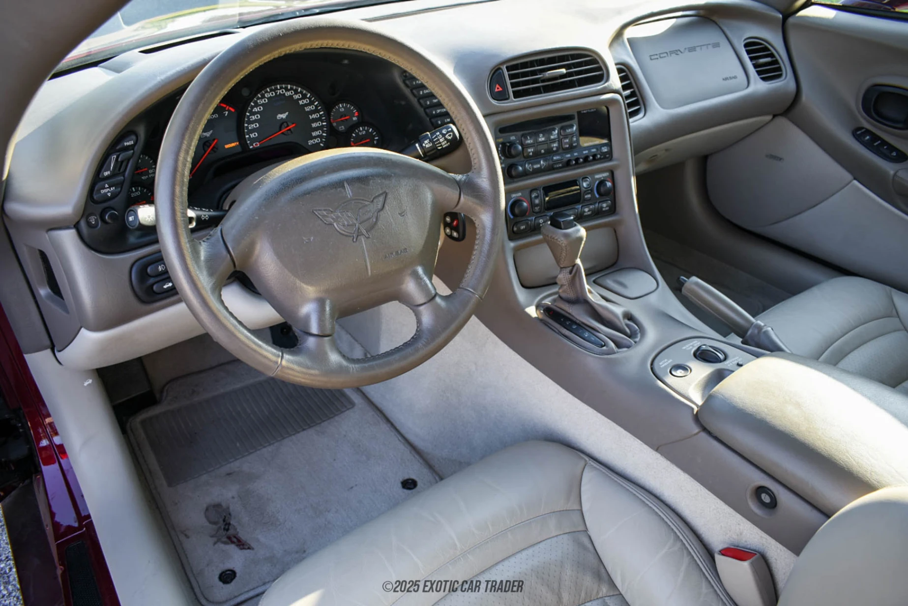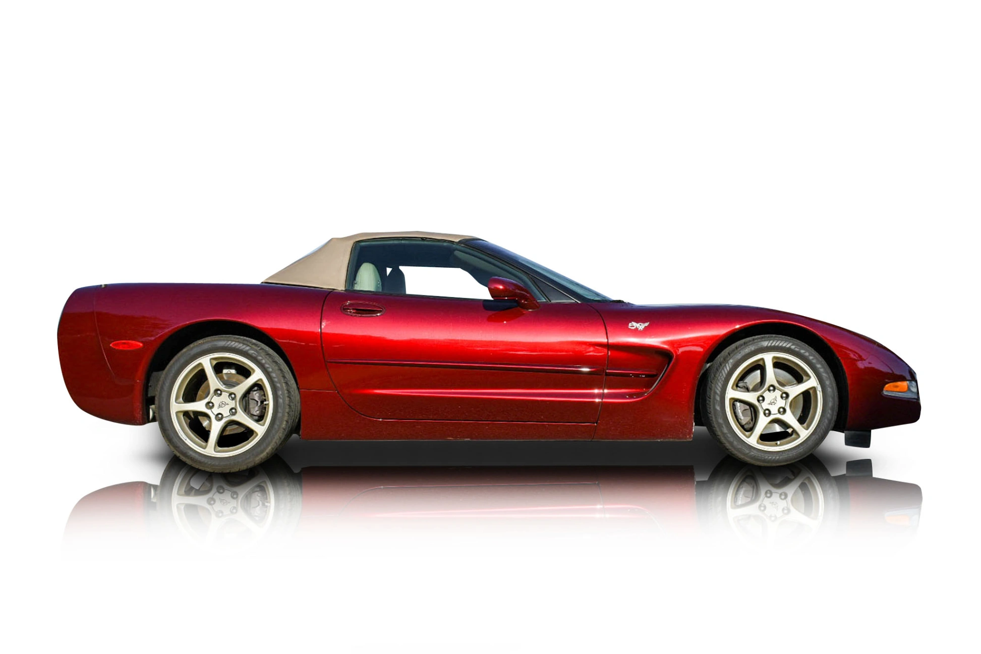 In its half-century edition, Corvette offered both coupé and convertible versions. All of these cars were draped in a special shade of red paint that Chevrolet dubbed the "Anniversary Red Metallic." As you walk around the car, you will notice that it features body-color bodyside moldings, giving the exterior nice visual characteristics while maintaining a sleek look. It is topped with a Shale color convertible top that harmonizes with the interior color. The vehicle rides on 17” 5-spoke wheels featuring the Corvette center caps. Wrapping around the wheels are Goodyear Eagle F1 tires providing optimal grip. The Shale interior is unique to the 50th Anniversary Edition Corvette as well. This space offers you Highwear Nuance Leather Seat Trim and is equipped with Preferred Equipment Group 1. The passengers can be kept entertained thanks to the 12 Disc CD Changer Sound System with a Remote, which also adds an old-fashioned touch to the interior.