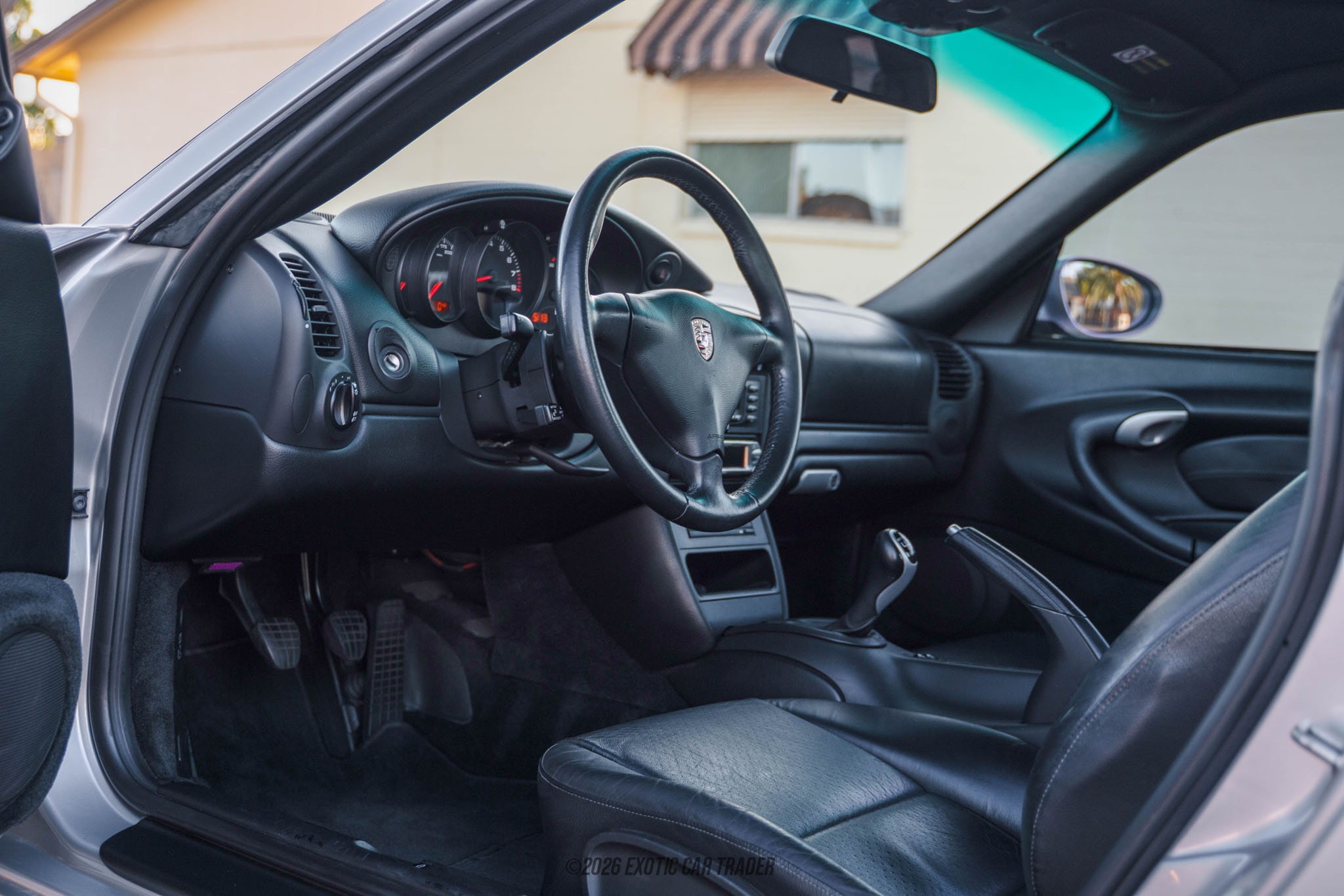 Finished in Arctic Silver Metallic, the exterior of this 2003 Porsche 911 Carrera presents a timeless and restrained appearance that suits the 996.2’s clean, functional design. The car wears Sport Classic–style multi-spoke wheels, which are not original to the vehicle but remain period-correct in appearance and enhance its overall stance. Inside, the black leather interior maintains a driver-focused layout with a straightforward cockpit design that emphasizes ergonomics and visibility. Manual sport seats, a three-spoke leather steering wheel, and factory heated seating contribute to a purposeful yet comfortable cabin, while a period aftermarket head unit has been integrated to provide modern functionality without disrupting the interior’s cohesive look.