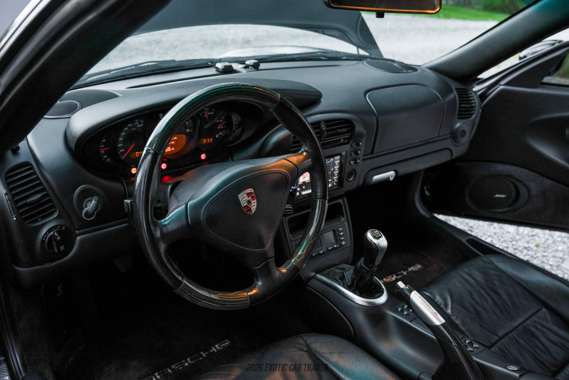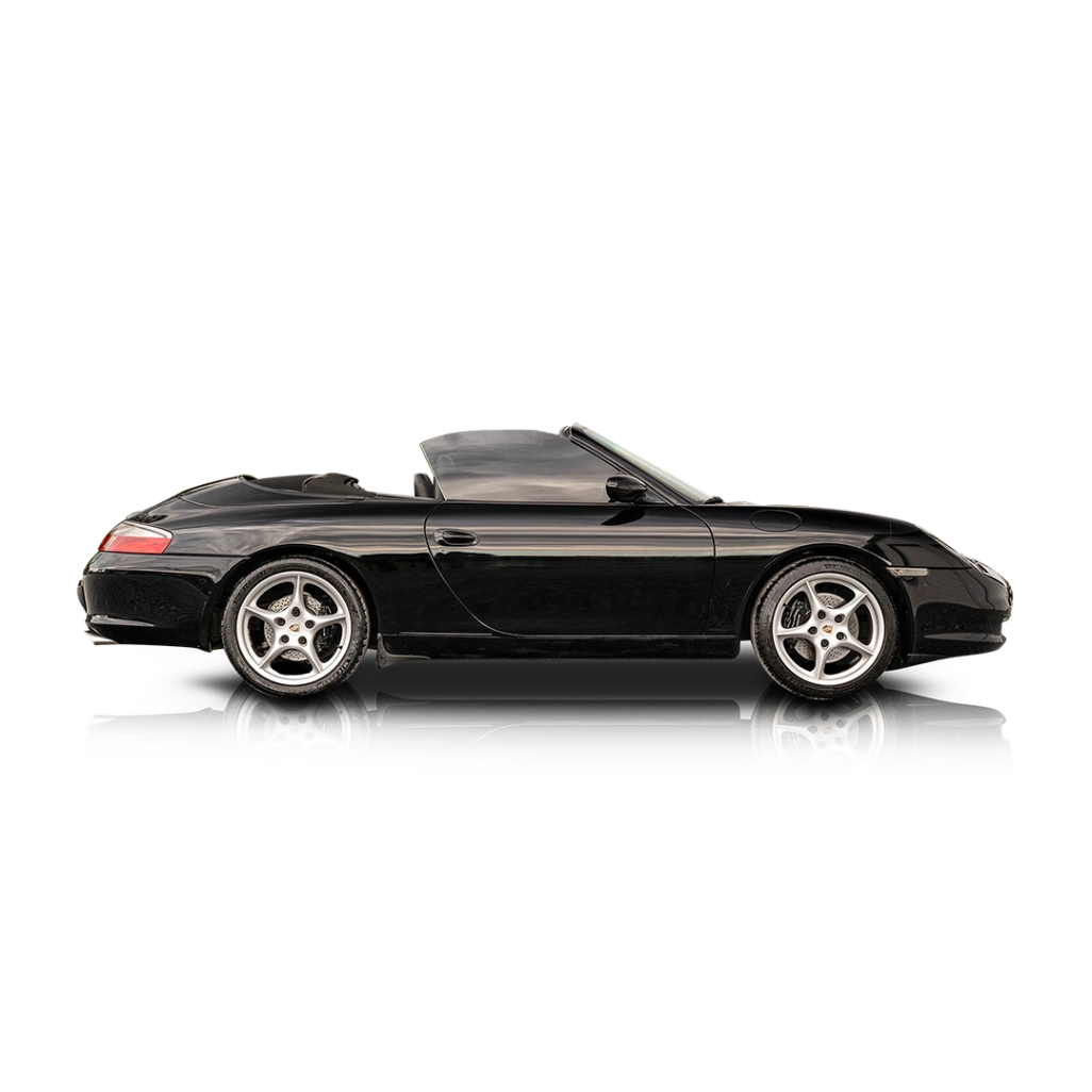The exterior of this 2003 Porsche 911 Carrera 4 Cabriolet is finished in Black, a timeless color that accentuates the 996’s smooth and understated design language. The cabriolet silhouette pairs elegantly with the black soft top, while 18-inch Carrera light alloy wheels and colored Porsche crest caps provide a subtle performance-focused stance. Xenon headlamps enhance both visibility and modern appeal, while details such as the Porsche windstop improve top-down comfort, making this car equally suited for spirited drives or relaxed cruising. The interior of this 2003 Porsche 911 Carrera 4 Cabriolet is trimmed in Black leather, elevated by the desirable supple leather option that enhances both texture and comfort. Carbon fiber and aluminum accents on the shift lever, brake handle, and steering wheel introduce a sportier, driver-focused ambiance. The Power Seat Package ensures adjustability for optimal driving position, while the Bose High-End Sound System delivers premium audio quality. Additional touches like carbon door sills and exclusive options reflect a thoughtfully specified cabin that balances luxury with Porsche’s motorsport-inspired roots.