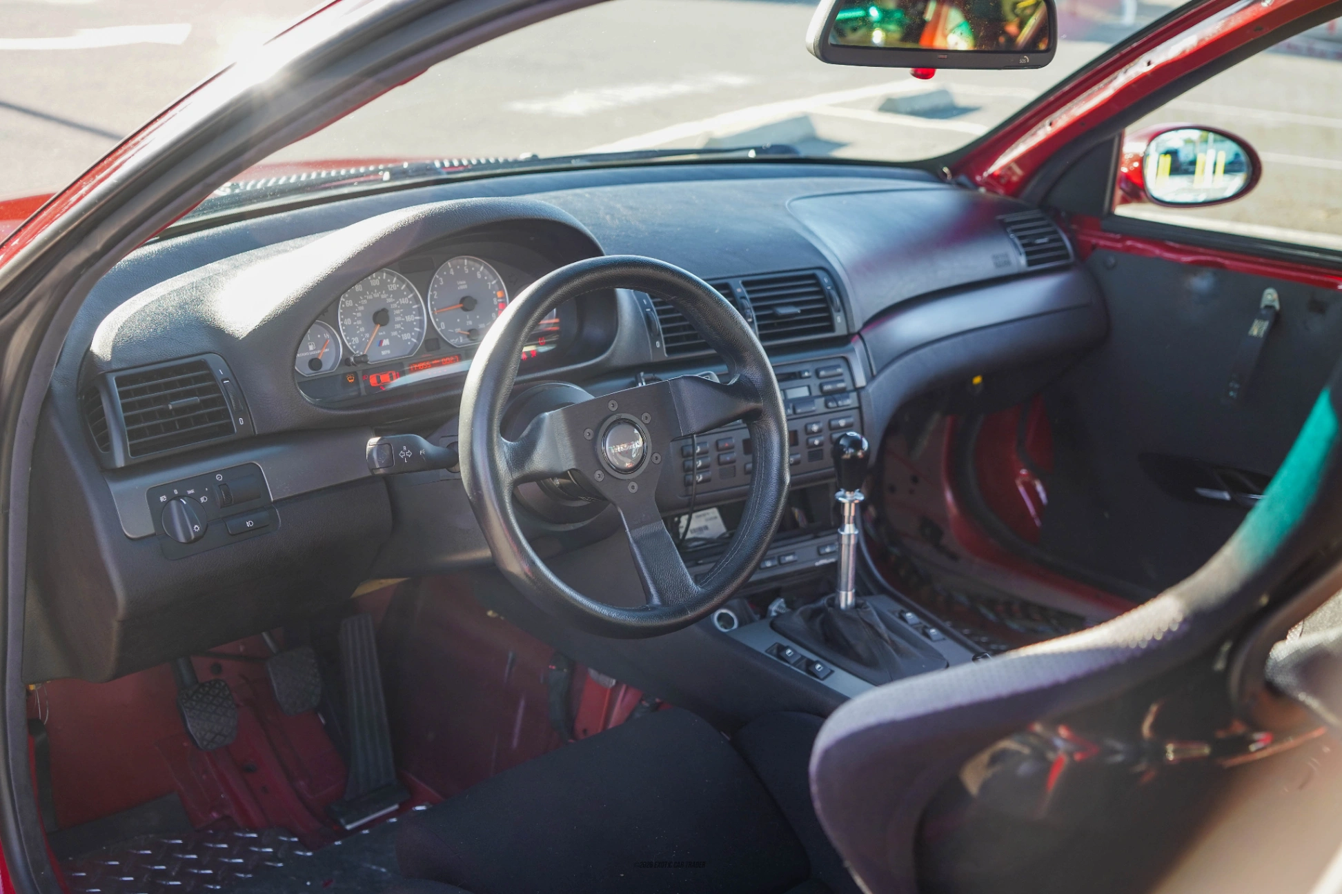 This 2005 BMW M3 is definitely made for the track, as you can tell from first glance. It’s painted in Imola Red, but the most prominent feature has got to be its sky-high rear spoiler. Then, you notice that the entire car hugs the ground thanks to the JRZ Pro suspension, and rolls on performance tires wrapped around Volk Racing TE37 wheels that are 18 inches in diameter. There’s also a sunroof delete in place. The stripped out interior of this 2005 BMW M3 retains its dashboard, thankfully, as well as the air conditioning and heating. However, it’s been fitted with a roll cage and has just a single Recaro seat for the driver. There’s also a CAE shifter but everything else appears stock, save for the steering wheel.