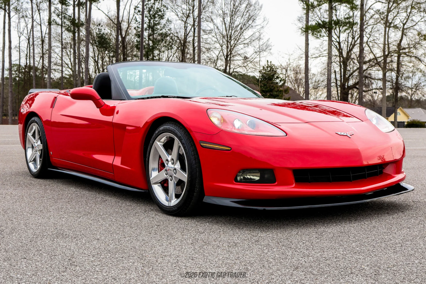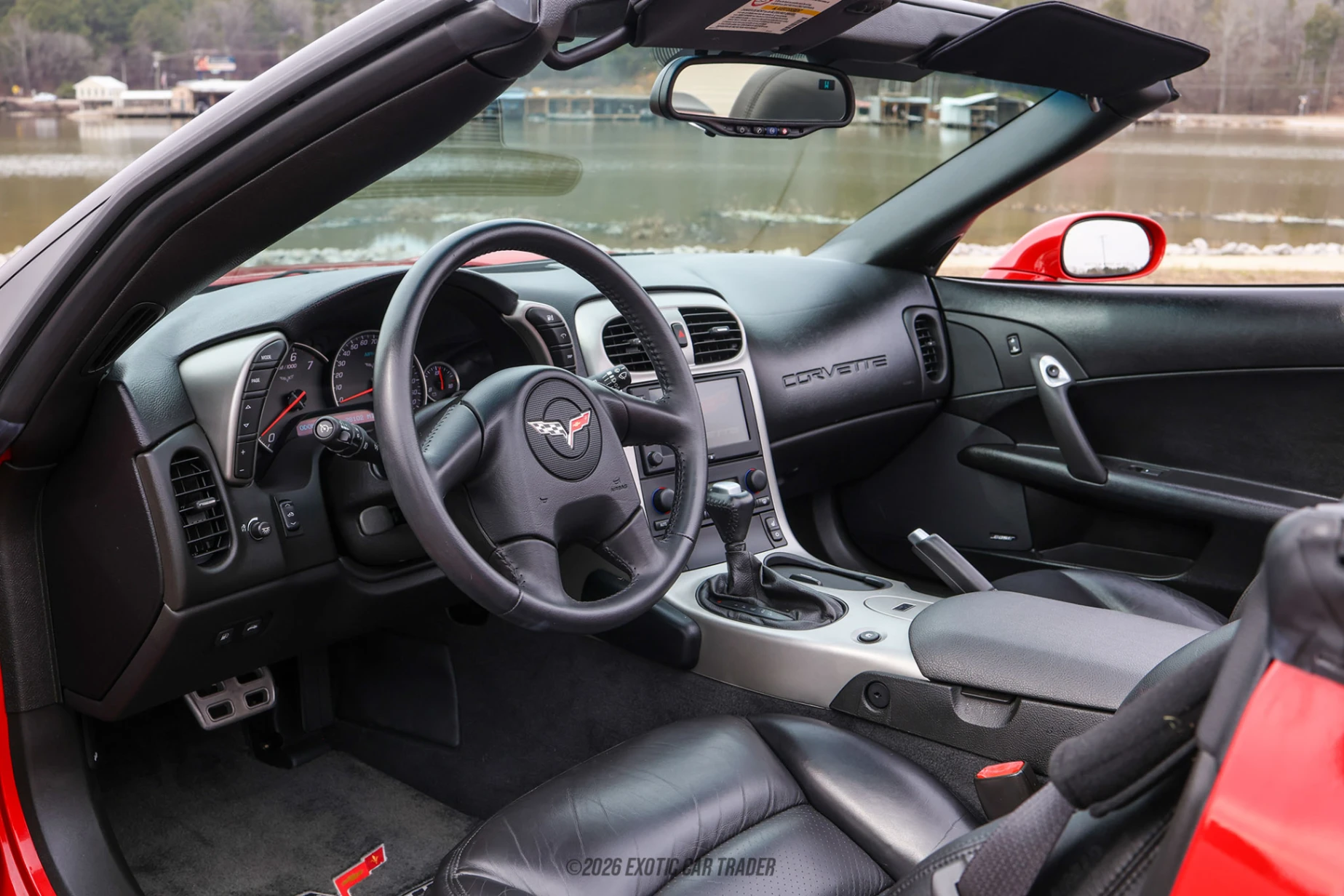 The 2005 Chevrolet Corvette Convertible marked a historic design shift, becoming the first Corvette since 1962 to feature exposed headlamps. Its sleek, tightly drawn body was the result of more than 400 hours of wind tunnel development, achieving a drag coefficient of under 0.29. Finished in Victory Red, this C6 presents with sharp, modern proportions that still retain unmistakable Corvette character. As a convertible, it is fitted with a black power-folding soft top that retracts seamlessly for open-air driving. The car rides on factory polished aluminum wheels in a staggered configuration. According to the current owner, the taillights and side markers have been upgraded with LED bulbs for improved visibility and a modernized appearance. Inside, the cabin reflects the more refined direction Chevrolet took with the C6 generation. The black interior is accented by contrasting gray trim on the dashboard and center console, creating a clean and driver-focused layout. This example benefits from the Preferred Equipment Group, adding comfort and convenience features while retaining a purposeful sports car feel. LED interior lighting updates further modernize the cabin without detracting from its factory design, resulting in a cockpit that feels both contemporary and true to its early-C6 roots.