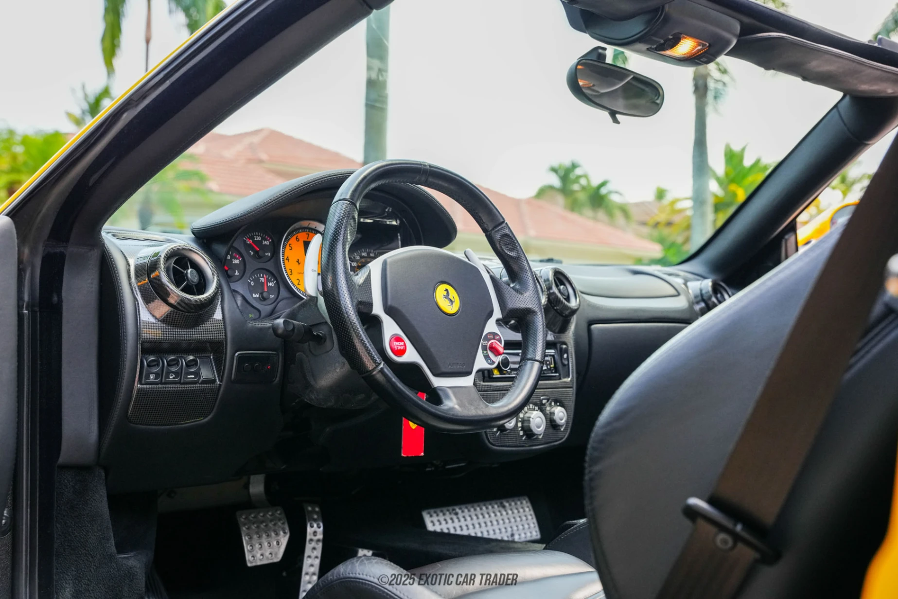 Rosso Corsa or Racing Red is Ferrari’s most popular color, but Giallo Modena is actually the very shade of yellow that is found in the Ferrari badge itself! Naturally, Ferrari offers this triple-coat yellow as a body color, which is what this 2006 Ferrari F430 Spider bears. With its aftermarket wheels, yellow-painted brake calipers and underpinned by an aluminum space frame, the car is a true beauty to behold. Plus, the shimmering shade of yellow is protected by a ceramic coating for added peace of mind. The Nero (that’s black for you) interior of this 2006 Ferrari F430 Spider comes from a time when Ferraris packed modern features and creature comforts, but weren’t yet infiltrated by digital screens. So, you’ve got a very nice analog gauge cluster with a yellow-faced tachometer, an automatic climate control system with real buttons and knobs, and an aftermarket Kenwood head unit with CD, USB, Bluetooth and AUX capabilities. Since this car packs Ferrari’s F1-style automated manual transmission, you’ve also got steering column-mounted paddle shifters. Some carbon fiber dash trim is also present.