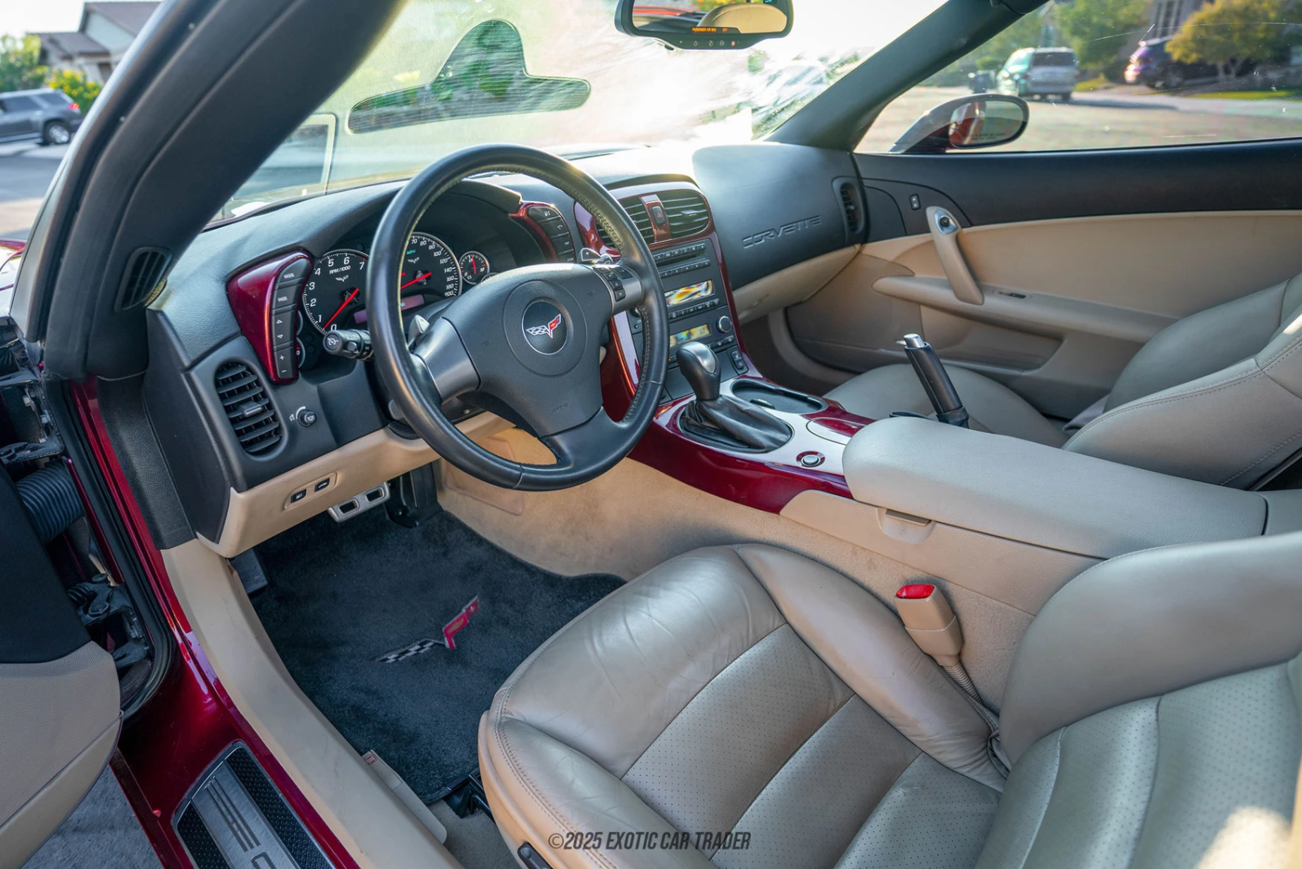 Monterey Red is the star of the show. It dances over every curve and sharp edge on the revised bodywork of the C6 Corvette. The tinted windows serve as a stunning contrast against the red paint. The convertible hardtop fits neatly into the back compartment, accessible by lifting the rear window. Adding to this beauty are multi-spoke silver wheels featuring the Corvette logo. Moving on to the back of the car, in the place of a spoiler is a sharp edge with a subtle ducktail fitted with a taillight. Your eyes will move downward to meet the quad exhaust tips that protrude out of the black rear diffuser. Matching those noisy exhaust tips are matching quad taillights. The beauty of this car continues to the interior as well, with its 3LT trim and Cashmere theme mixed with black and red inserts. The dash and steering wheel are black, while the center console is done in Monterey Red. The padded bucket seats are comfortable and great for cornering speeds. Behind the seats are a few storage compartments.