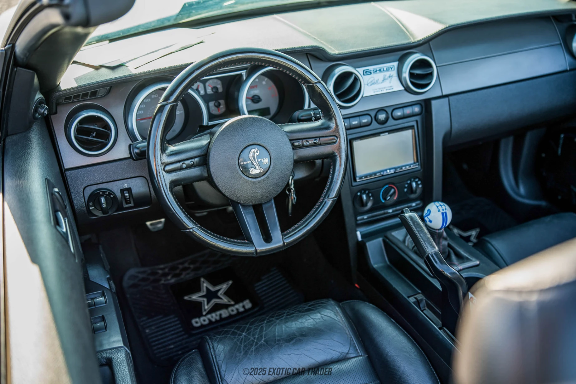 At the heart of the GT500 is a 5.4L supercharged V8 that drives the rear wheels via a Tremec 6-speed manual transmission and a limited-slip differential. It has an aftermarket dual exhaust system and K&M air filters. The suspension is SVT-tuned, consisting of a MacPherson strut suspension system at the front and a solid axle 3-link suspension at the rear. The braking system is very competent too; power 4-wheel ventilated disc brakes with BREMBO brake calipers.