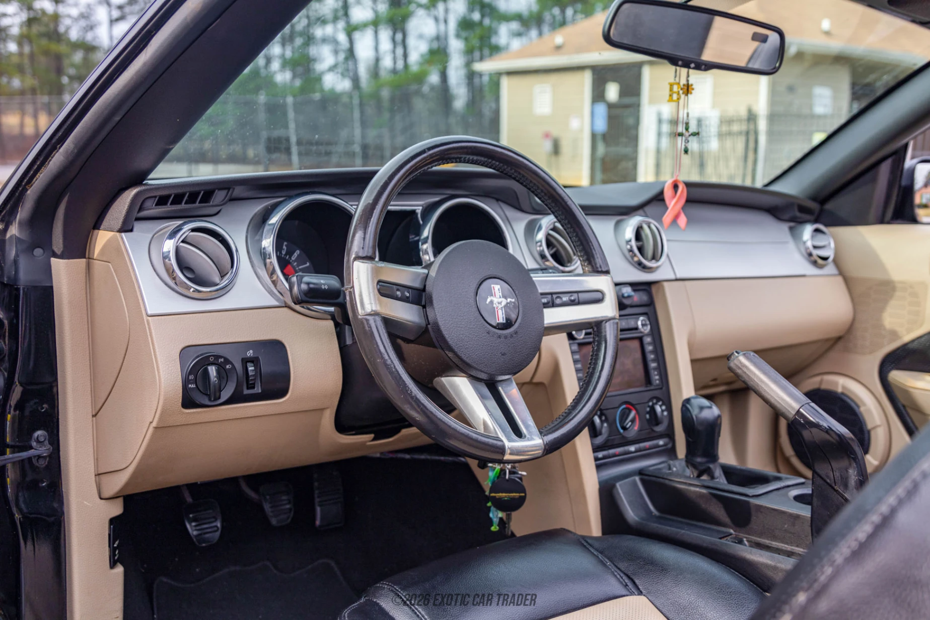 Wearing a suit of black paint and riding on an eye-catching set of silver five-spoke alloy wheels, this 2008 Ford Mustang GT is a sure-fire head turner. The car’s aggro looks are most prominent at the front, where two glaring headlamps frame a gaping maw of a grille that sits replete with two driving lamps, just like the first-generation Mustang sported. Then, you’ve got a prominent chin splitter, side skirts, and a rear spoiler. As for weather protection, there’s a power-operated soft top in matching black. We also note that the taillamps have received the black-out treatment. The interior of this 2008 Ford Mustang GT features shades of tan and black for the seat upholstery, plus some aluminum-look silver dash and door card accents. The car comes features such as air conditioning, heated front seats, and a nice sound system too. Cruise control is present too, with buttons for controlling it on the steering wheel.